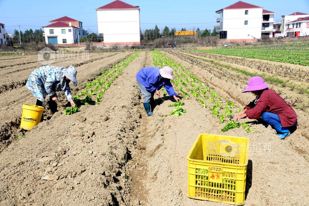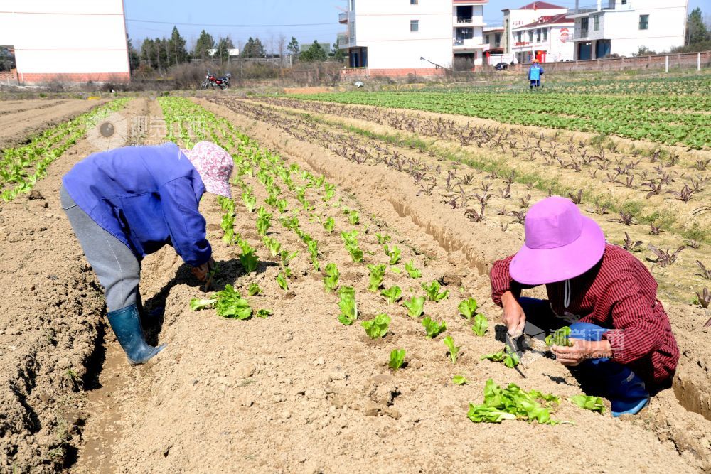 2021年2月19日,在江西省抚州市南丰县一蔬菜基地,农民们在田园中劳作,田间地头一派繁忙景象。