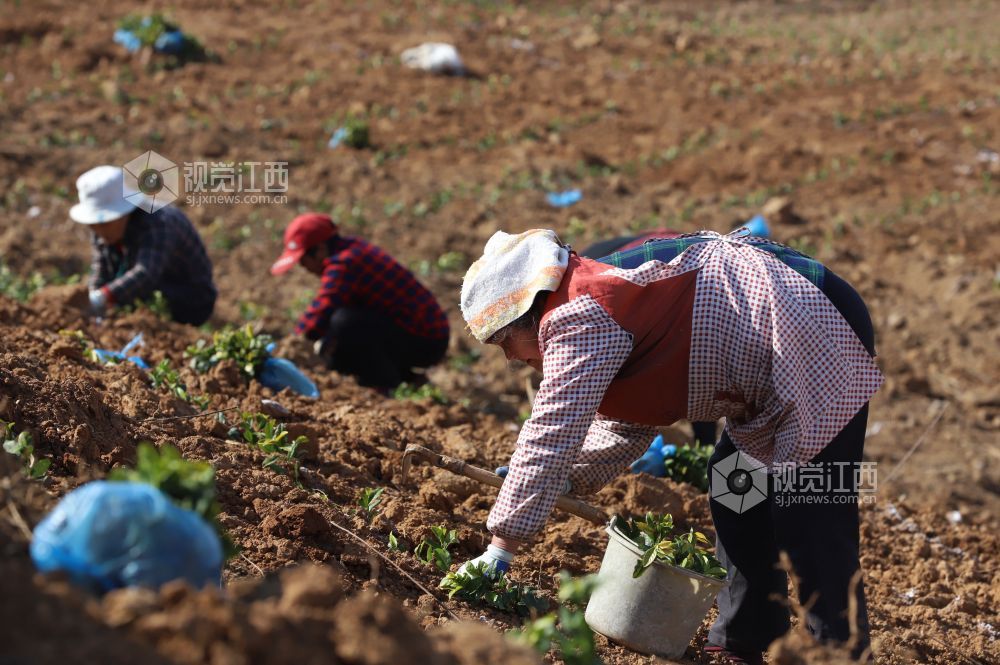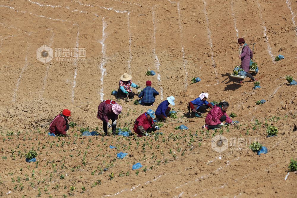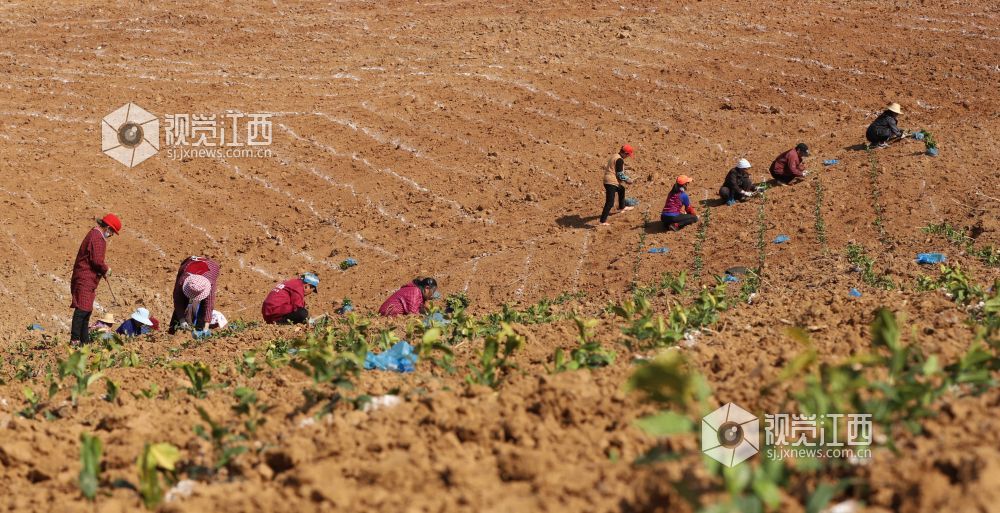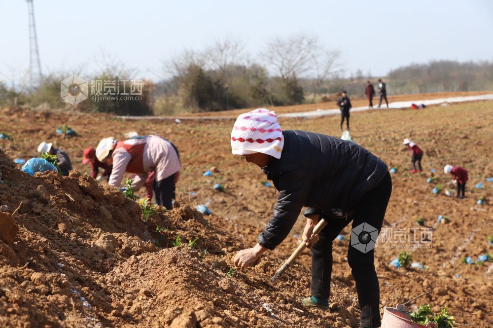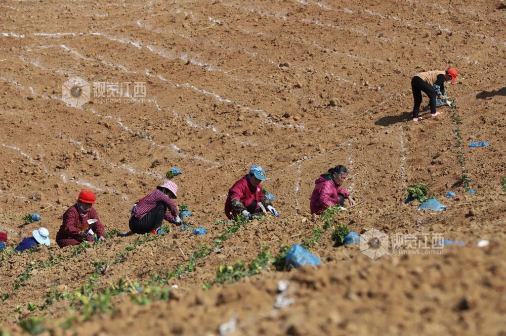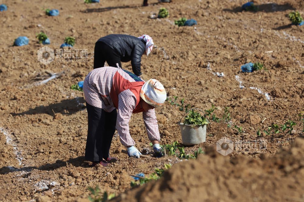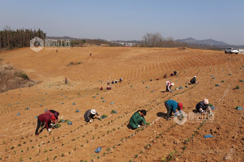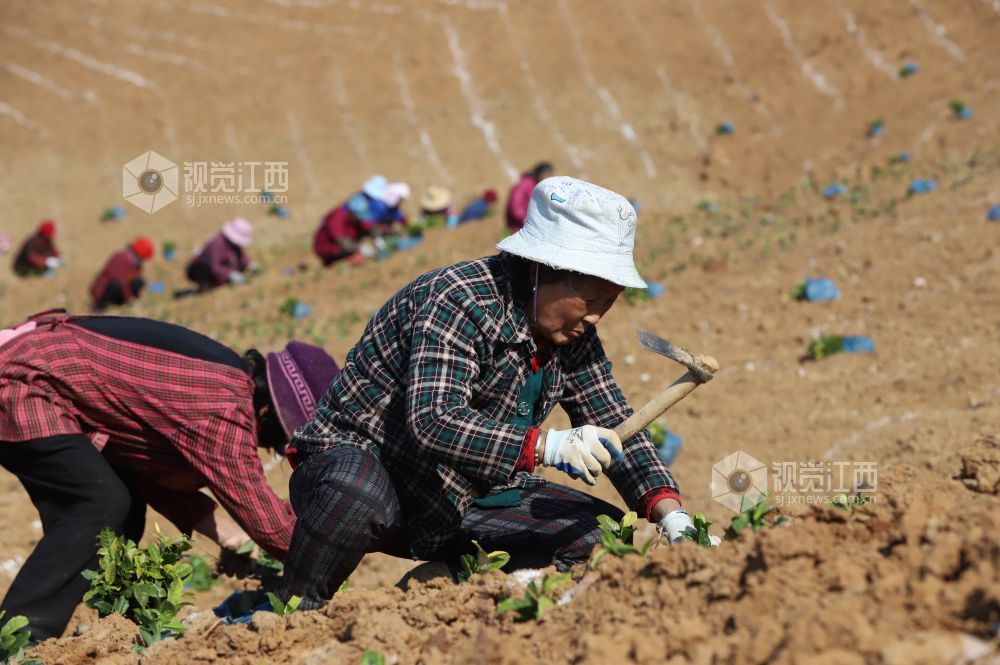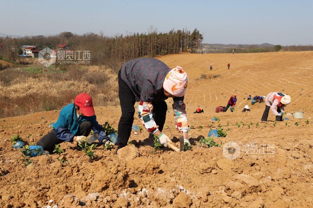 早春时节,在江西九江市彭泽县黄岭乡长乐村黄金芽茶叶种植基地的田间地头,到处呈现出繁忙的景象。当地村民正忙着整地、挖坑、放苗、培土,将黄金芽幼苗栽进土里。