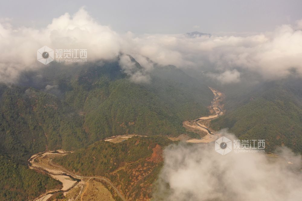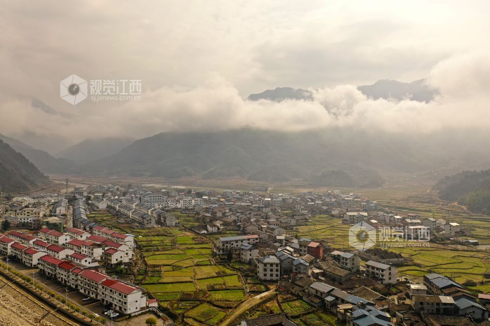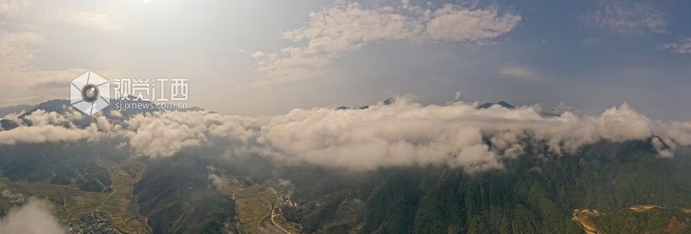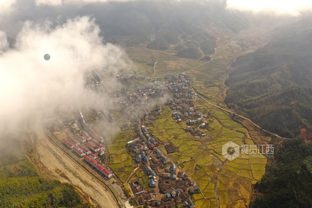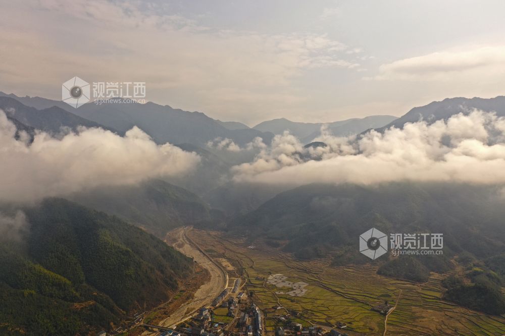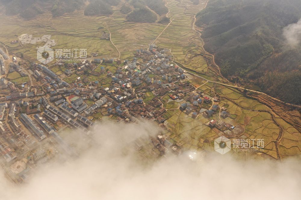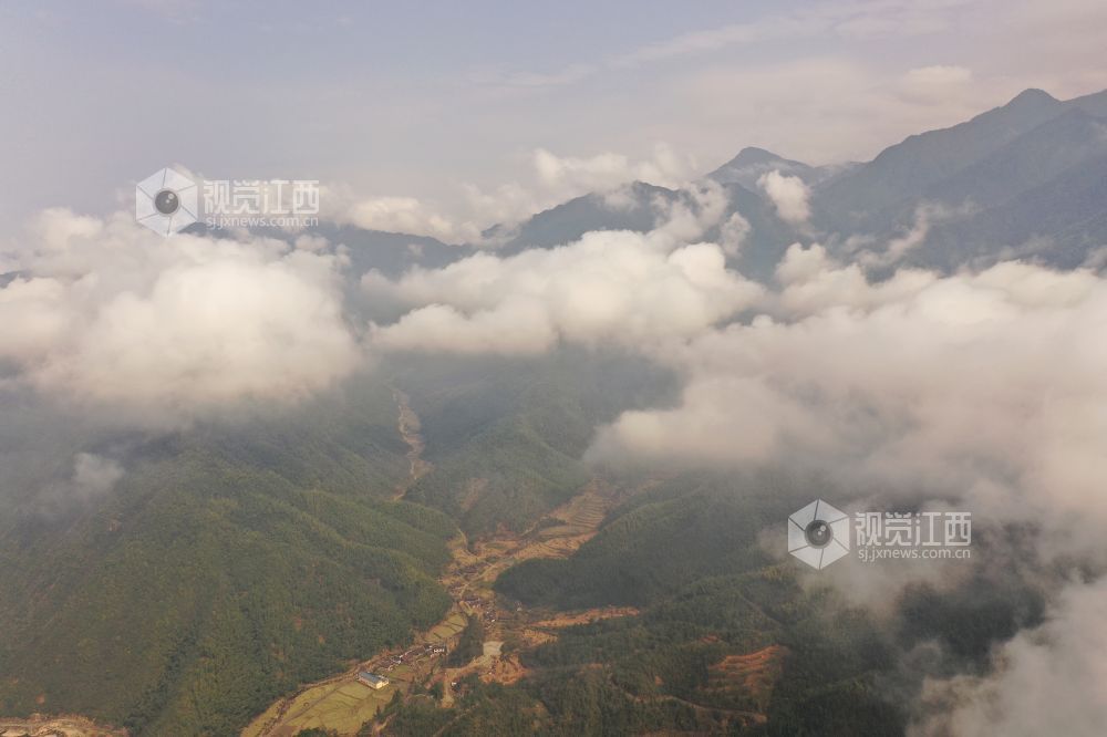 2021年2月23日,航拍江西省上饶市铅山县篁碧畲族乡云海,绿水、青山、白云、民房,犹如一幅美丽的水墨画。