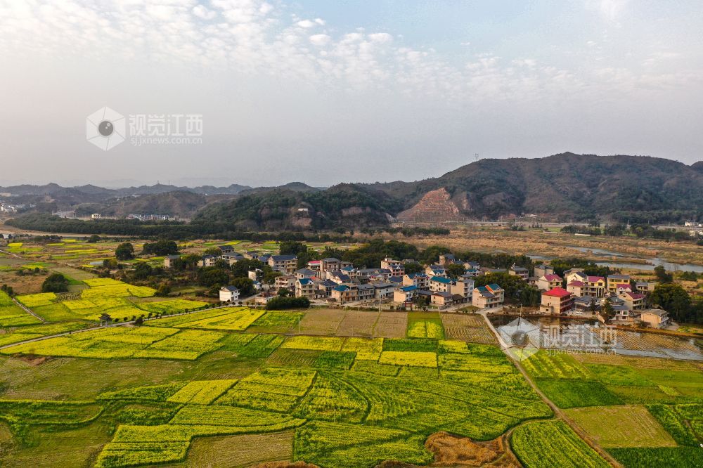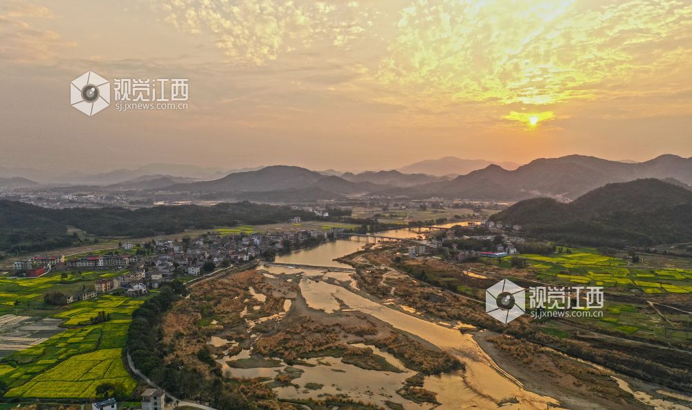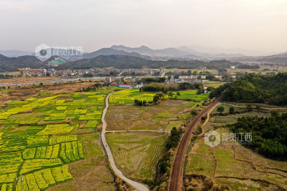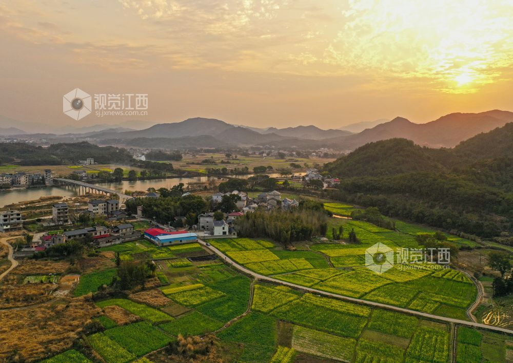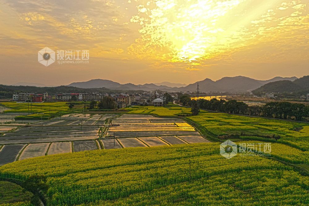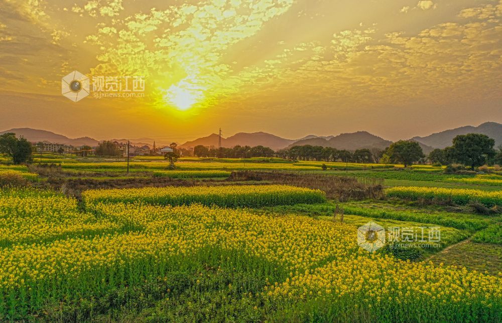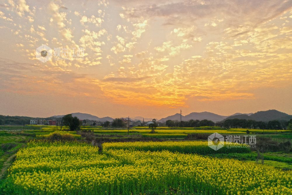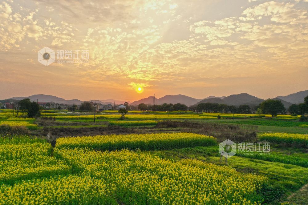 2021年2月24日,航拍江西省上饶市铅山县永平镇安州油菜花海,与落日余晖的形成了一幅美仑美奂的金色田园美景。近期,随着气温逐渐上升,大地回暖,铅山境内的油菜花竞相绽放,走在乡村田间地头,到处金光灿灿,透露出乡村特有的春意。