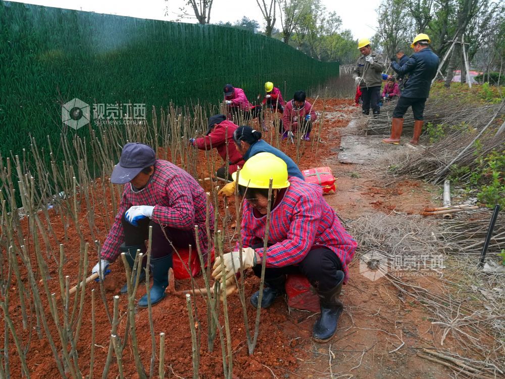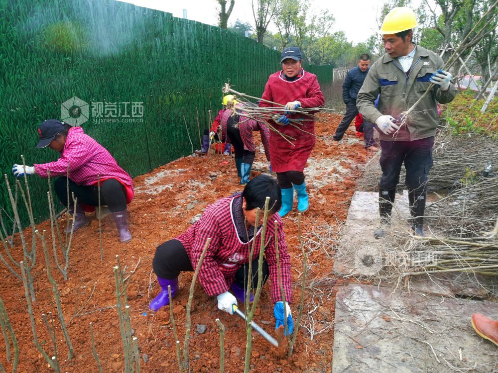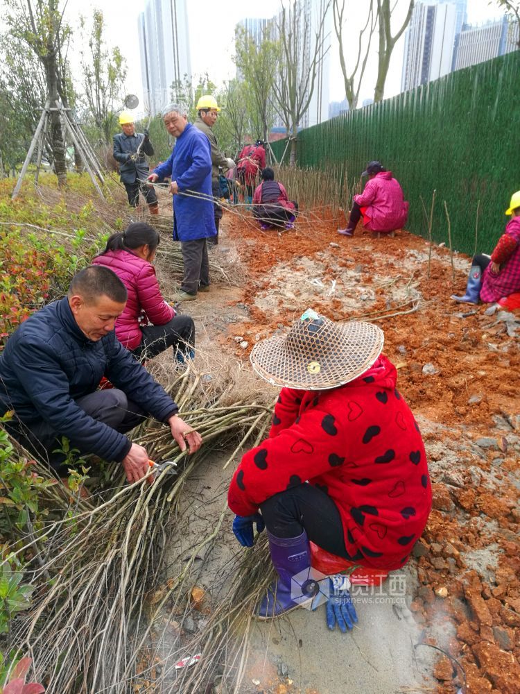 2月28日上午,江西省上饶市一批园林工人正在市区天佑大道上植树,工人们将一棵棵紫薇树苗进行修根和剪枝后栽植在道路的绿化带上。
