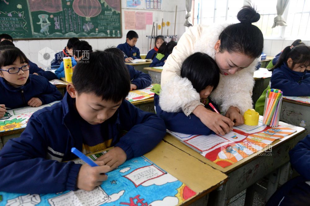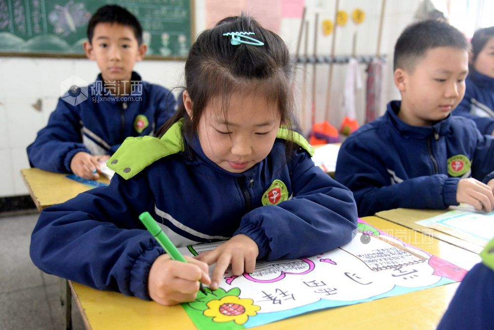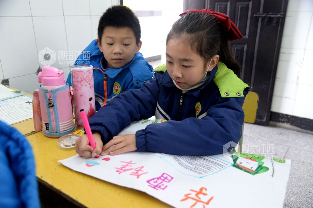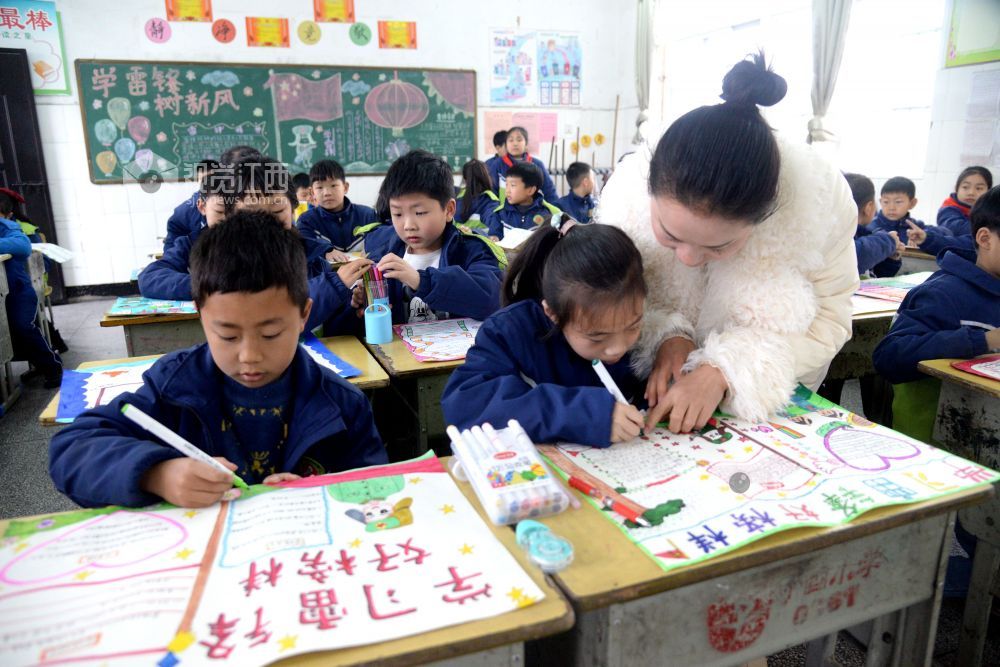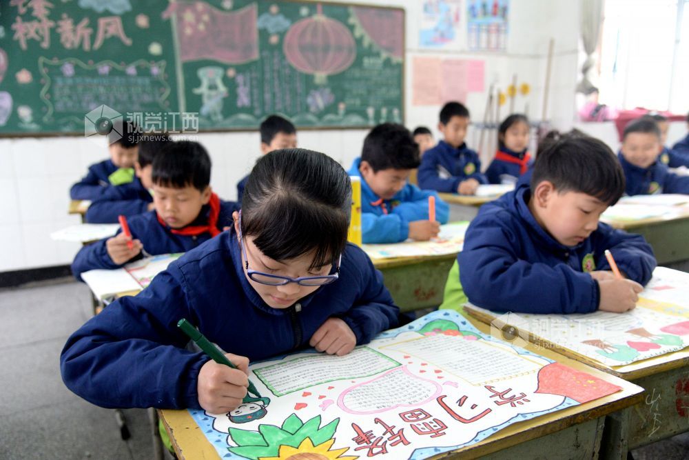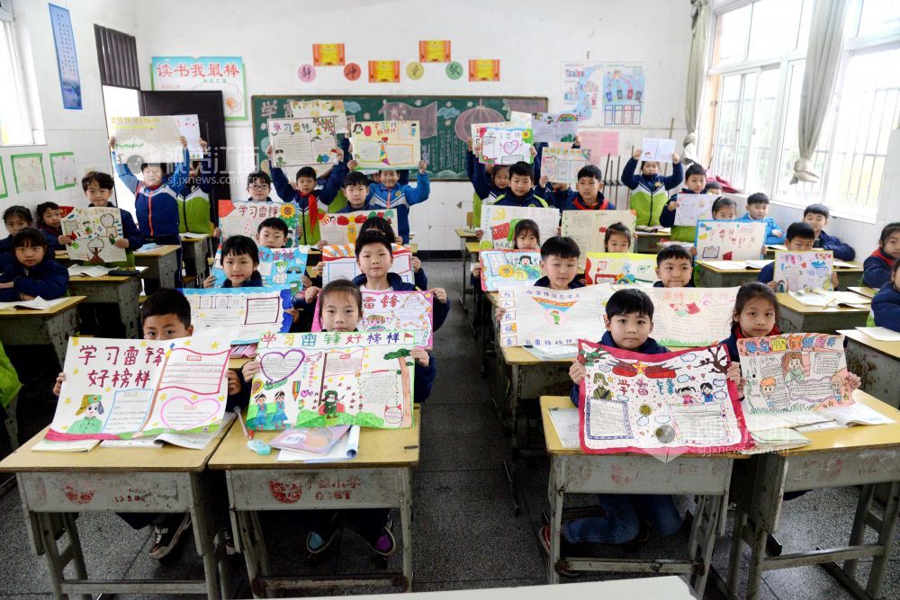 2021年3月3日,江西省抚州市南丰县一小学的学生正在绘制“学雷锋 树新风”手抄报,并将绘制好的手抄报进行展示。