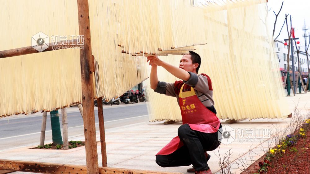 2021年3月4日,江西省抚州市金溪县浒湾镇“一水两岸”景观区,当地油面师傅在制作油面。“浒湾油面”是金溪县浒湾镇的传统名牌产品,始创于明朝末年,清代被选为宫廷食品,因面条匀净细长,状似龙须,故有“龙须贡面”之称。2010年,“浒湾油面”入选江西省非物质文化遗产名录。2011年,“浒湾油面”被认定为“中华老字号”。如今,仅浒湾镇老街区生产油面的作坊就达20余家,年产量达700多吨。这些纯手工油面,深受消费者青睐。
