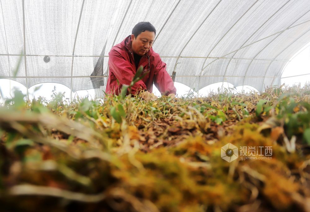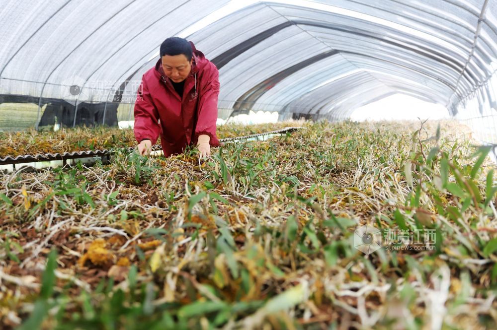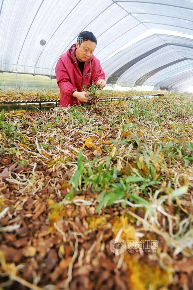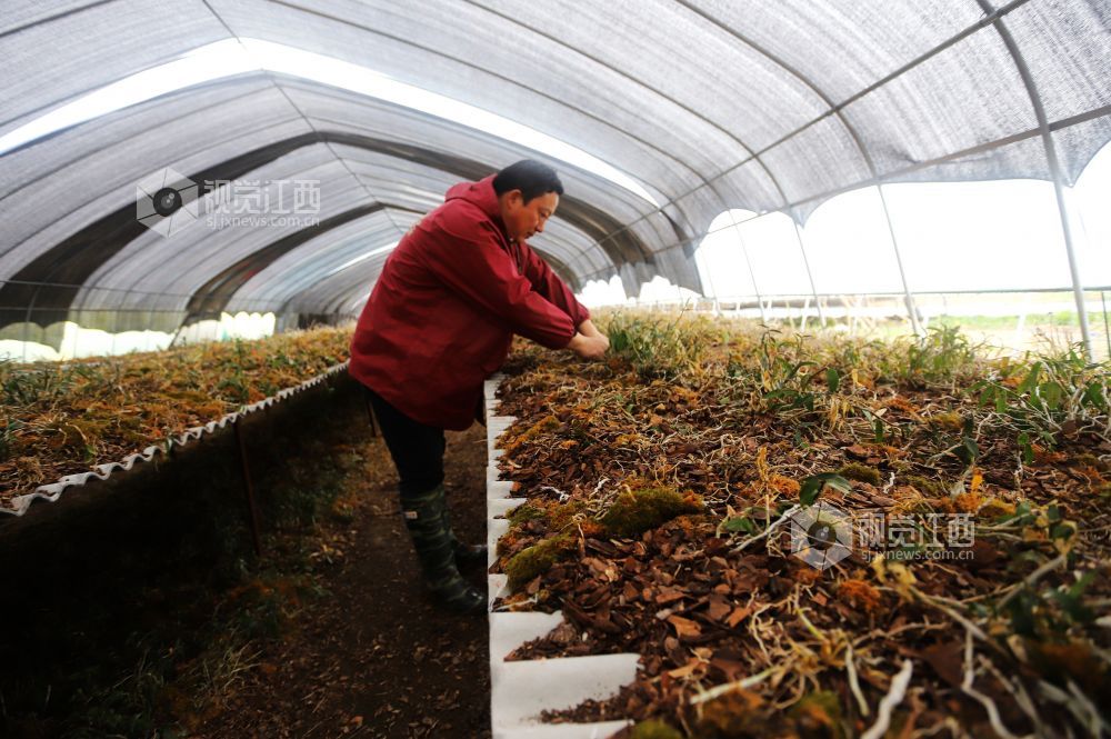 3月7日,江西省安福县横龙镇洲里村村民杨子江在大棚里管理铁皮石斛苗。