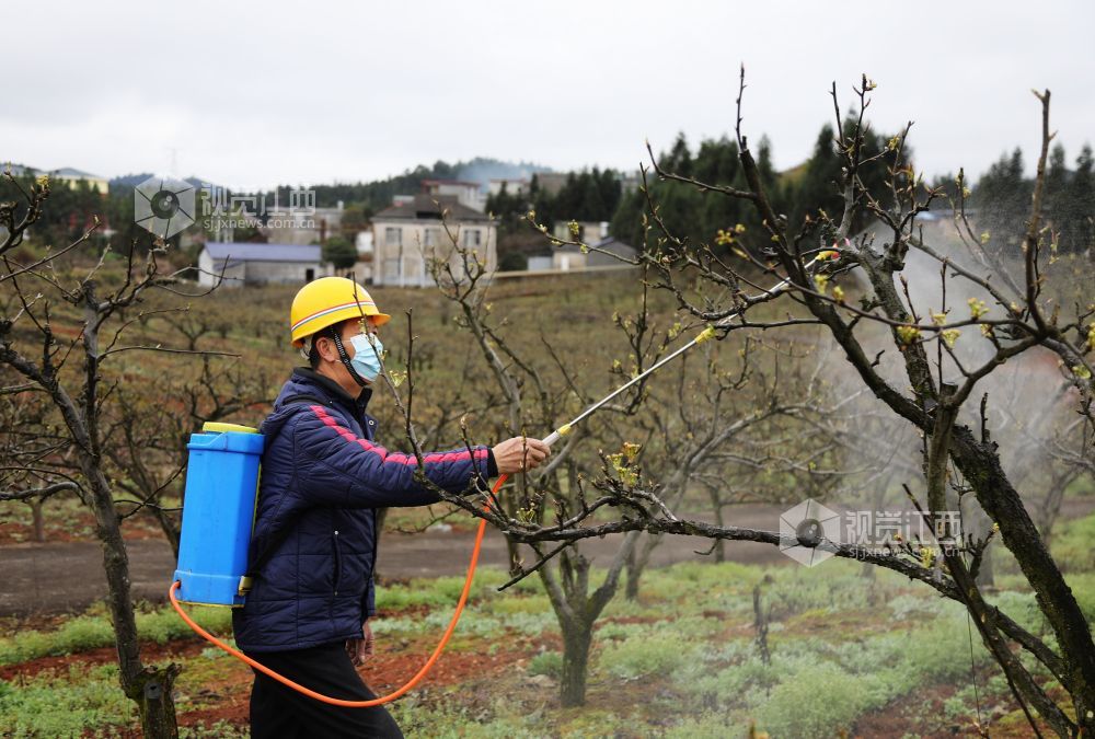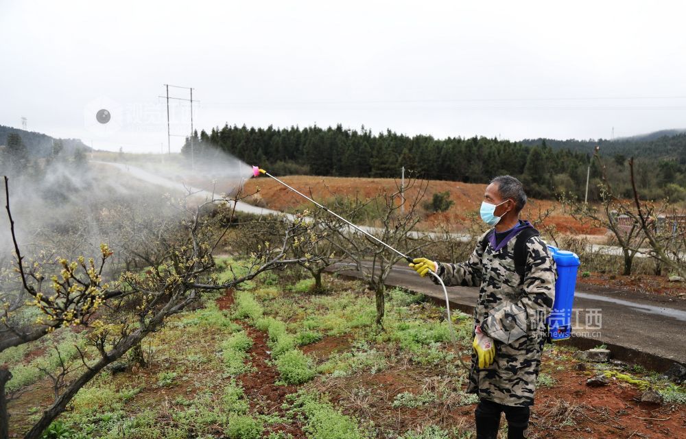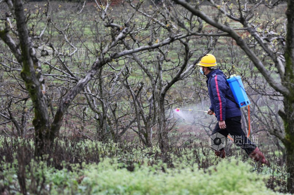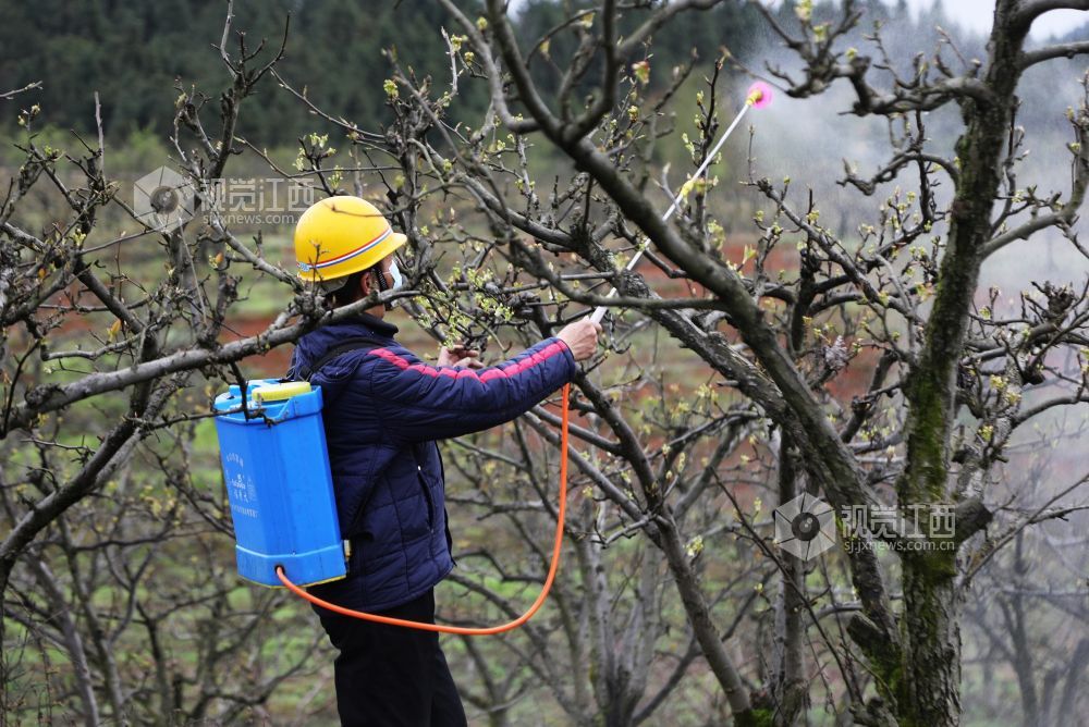 3月7日,江西省莲花县六市乡海潭村梨园,果农抢抓晴好天气,在梨树开花前,为梨树打药,防治病虫害,为今年的蜜梨丰收打下基础。