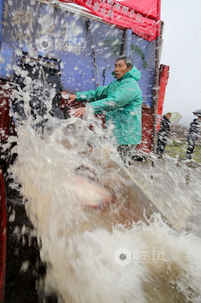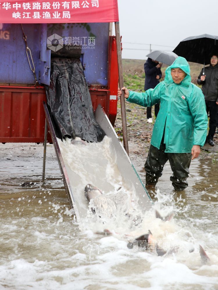 2021年3月8日,在江西省吉安市峡江县福民乡,人们将鱼苗投放入赣江。