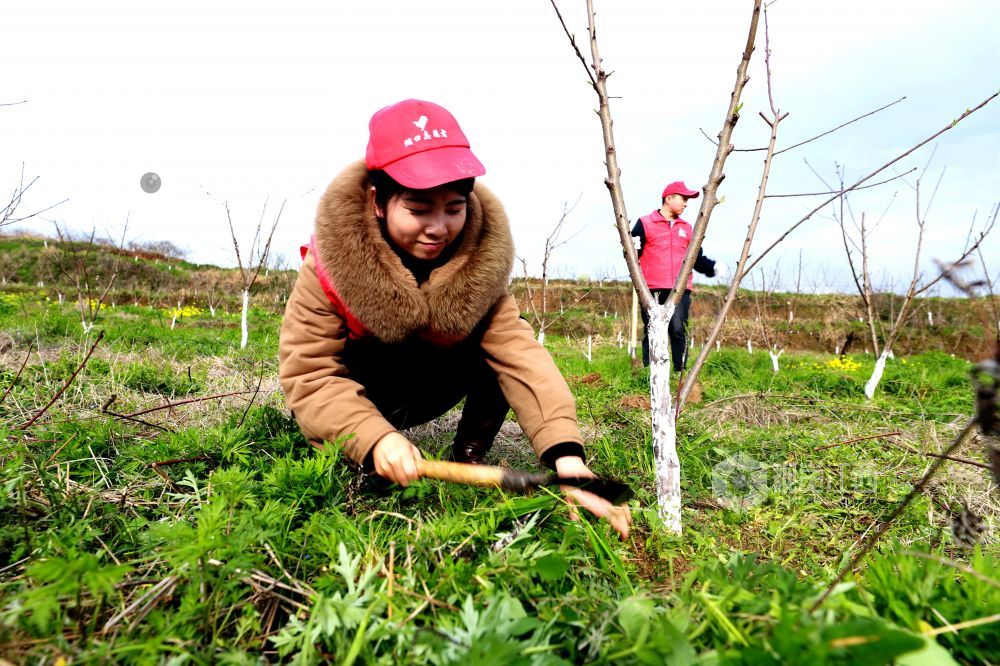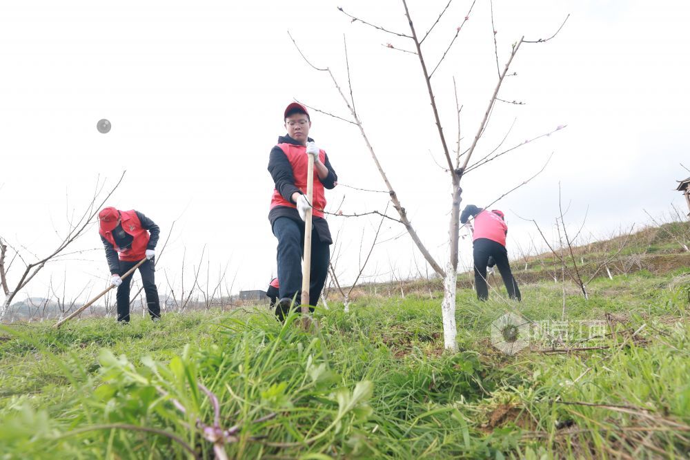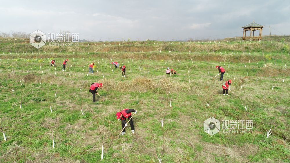 2021年3月9日,在江西省九江市湖口县马影镇柯观村农业基地,青年志愿者们正在帮助农户锄草。