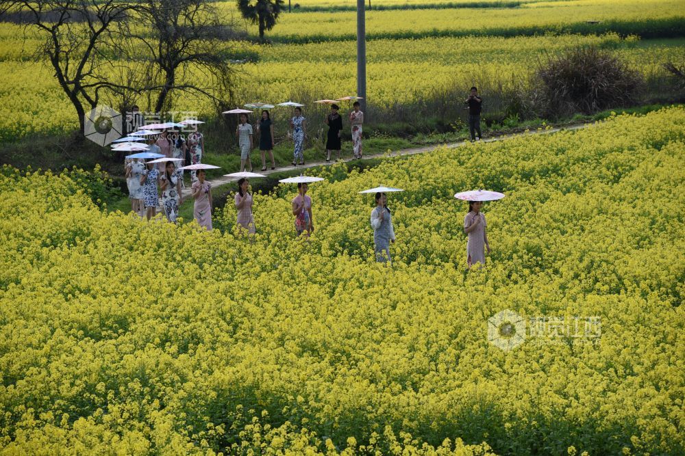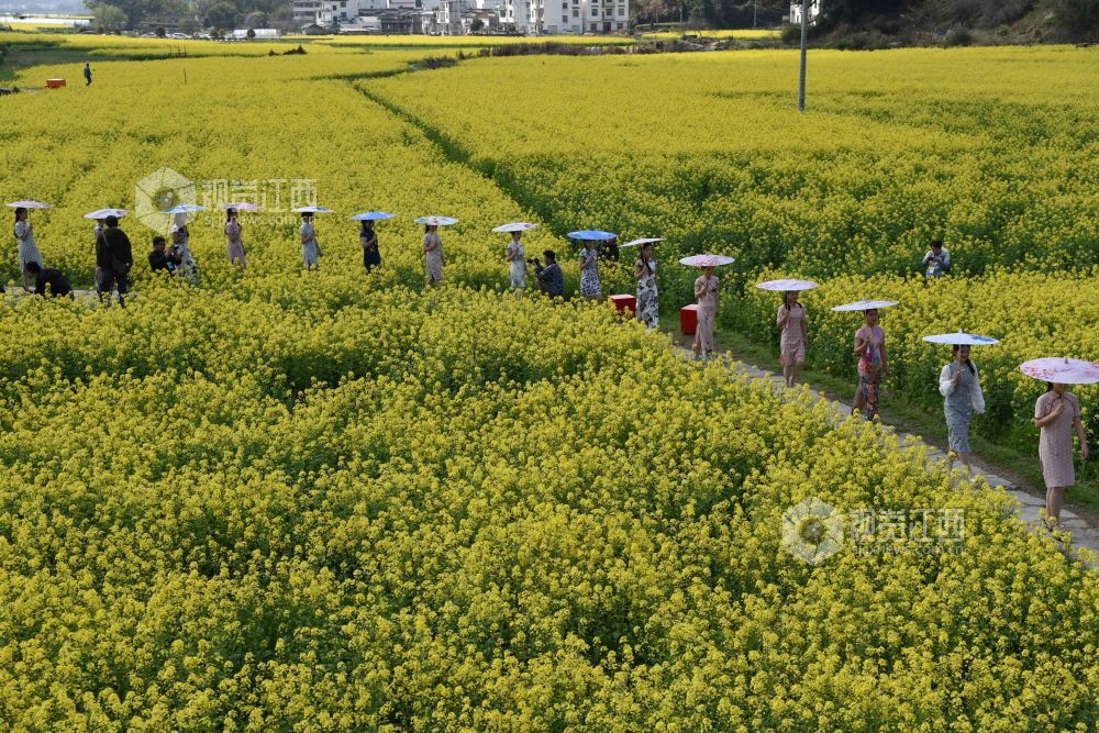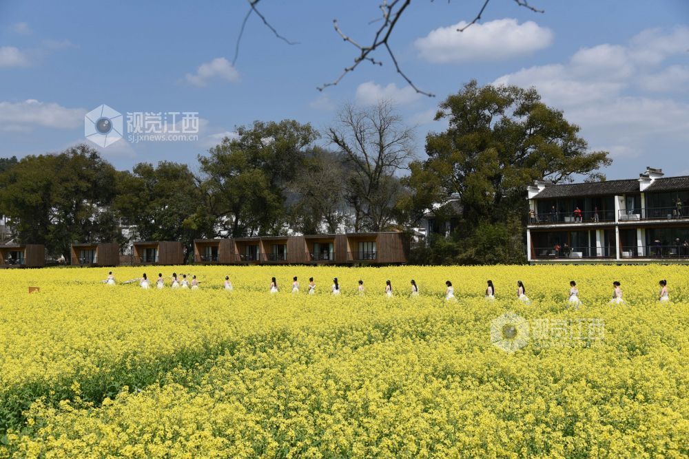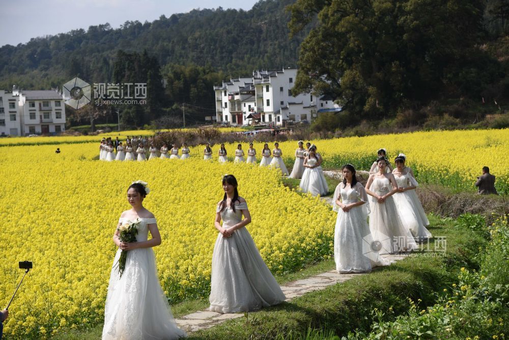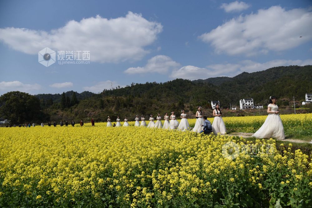 3月14日,江西省婺源县赋春镇举办田野舞台秀,以金色田野与乡村生活为鲜活背景,展示当地的非物质遗产、婚纱、旗袍、汉服、油纸伞等,与金灿灿的油菜花海相得益彰,吸引了众多游人驻足观看。