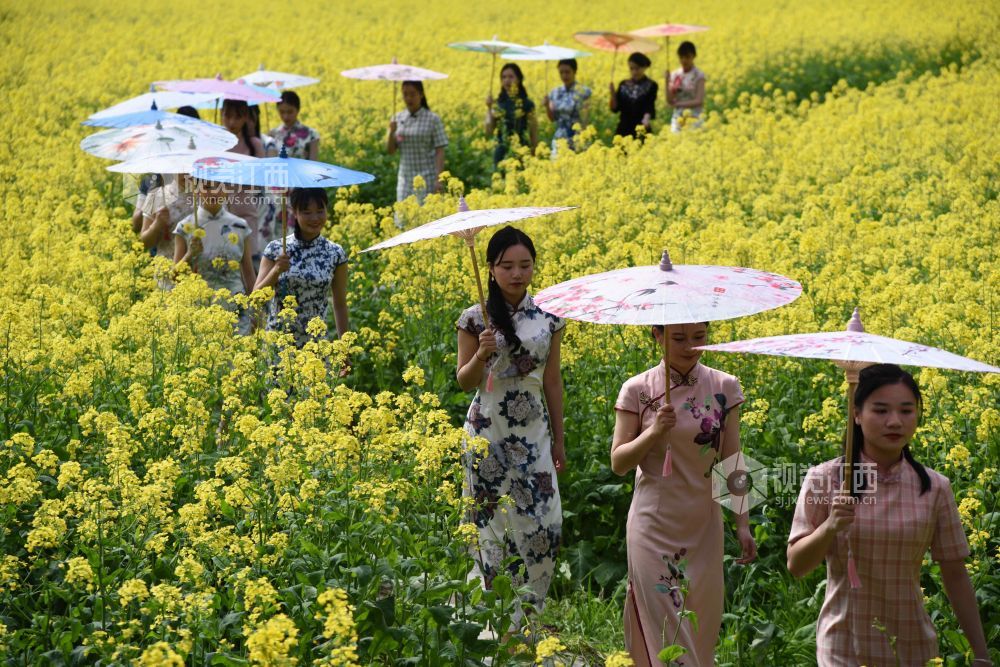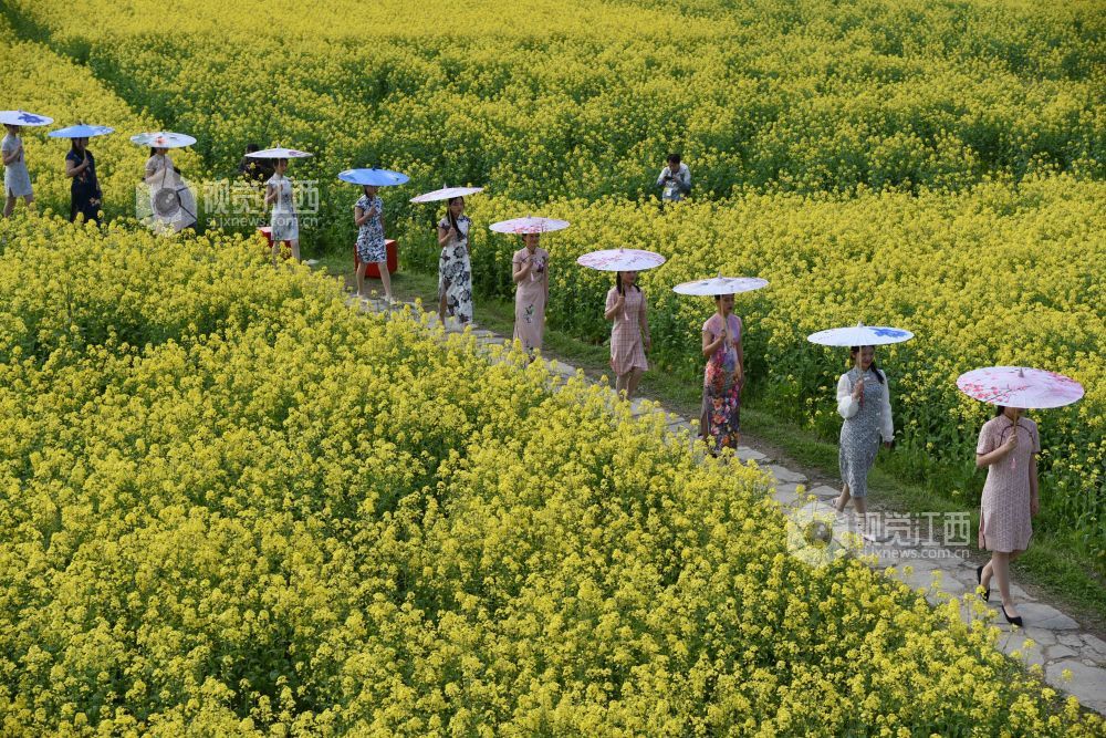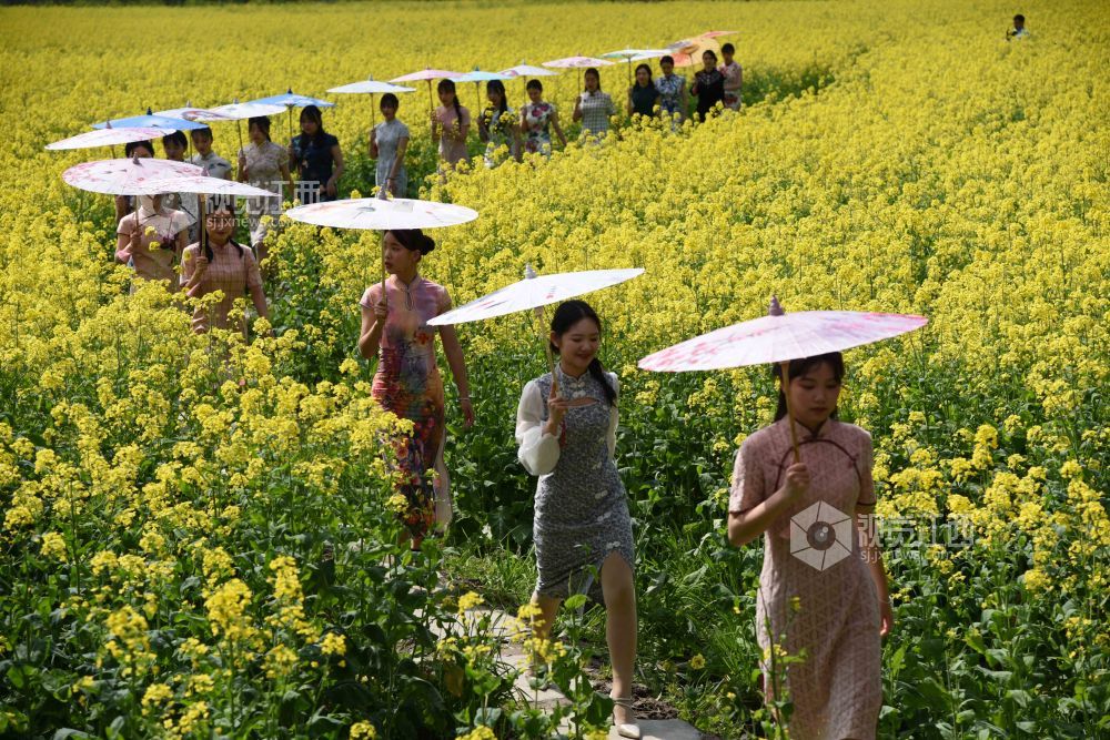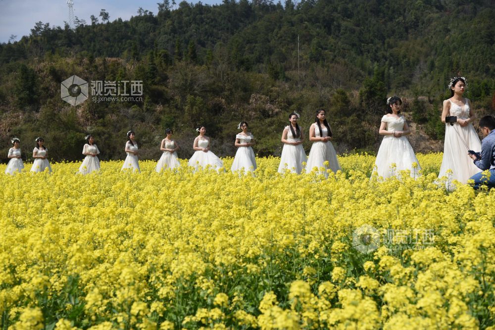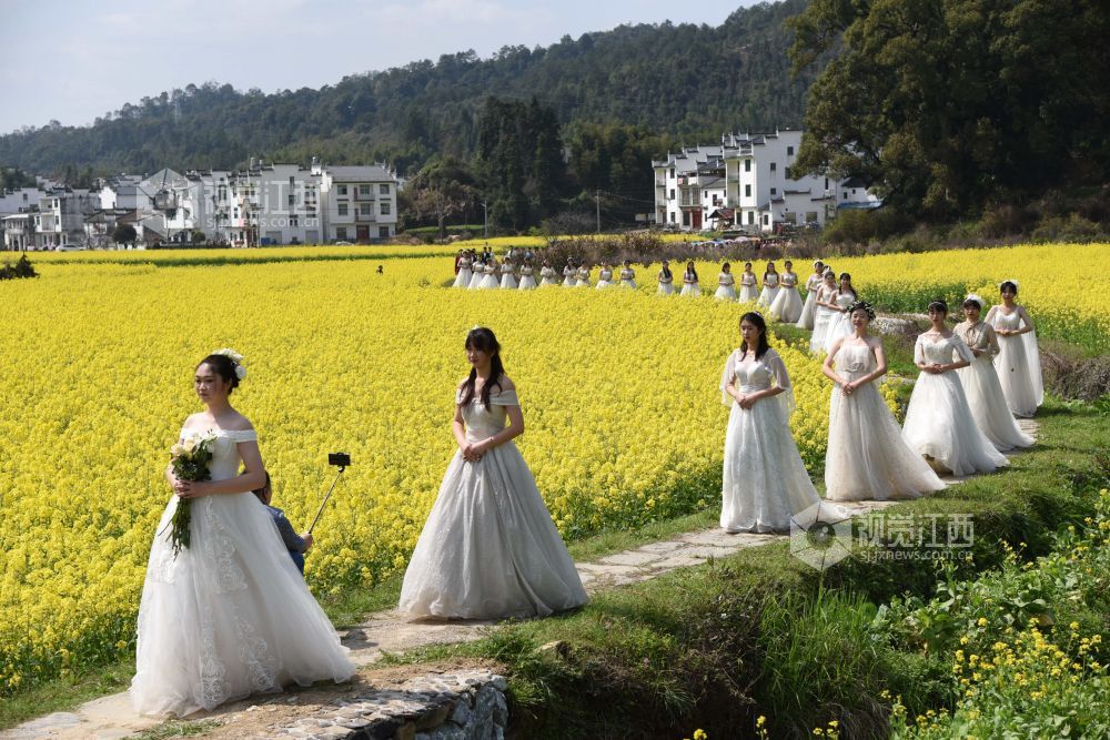 3月14日,江西省婺源县赋春镇举办田野舞台秀,以金色田野与乡村生活为鲜活背景,展示当地的非物质遗产、婚纱、旗袍、汉服、油纸伞等,与金灿灿的油菜花海相得益彰,吸引了众多游人驻足观看。