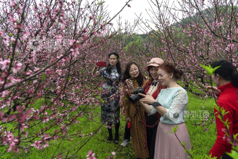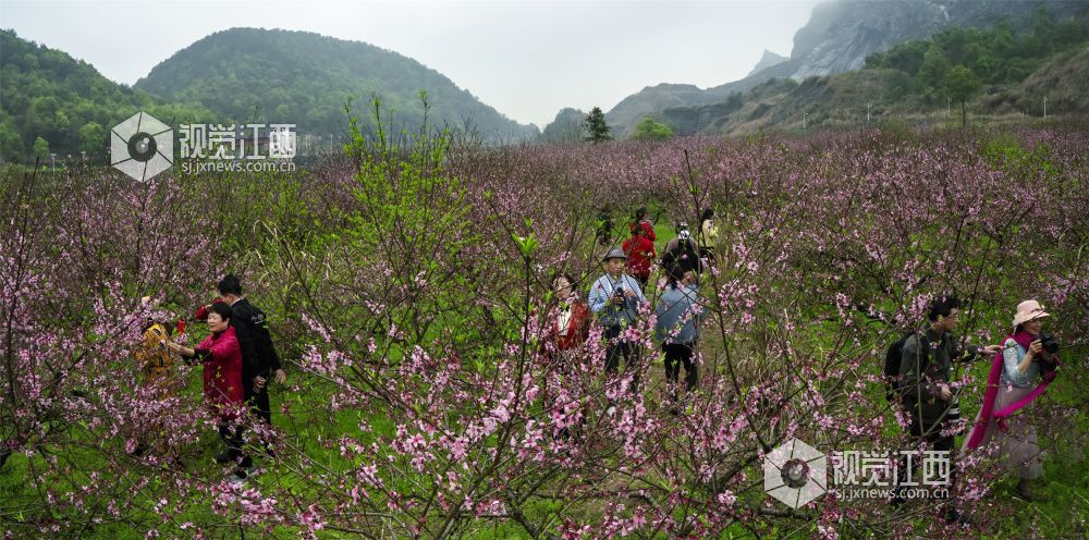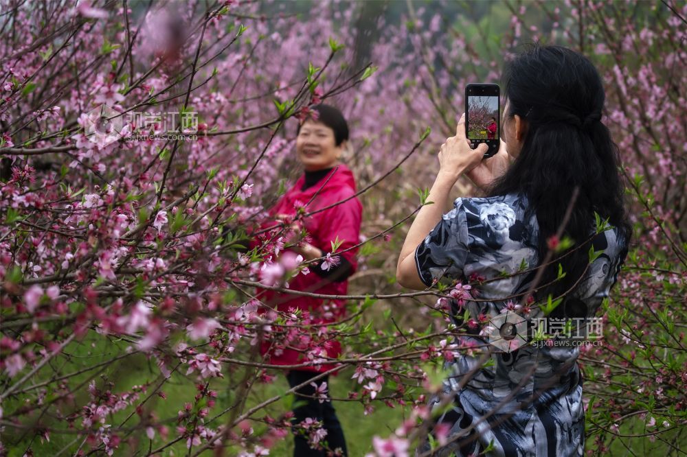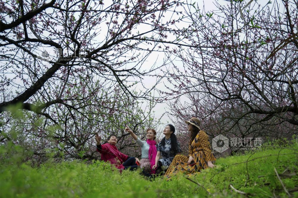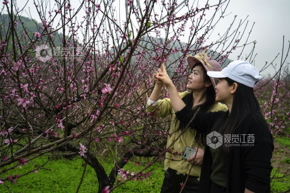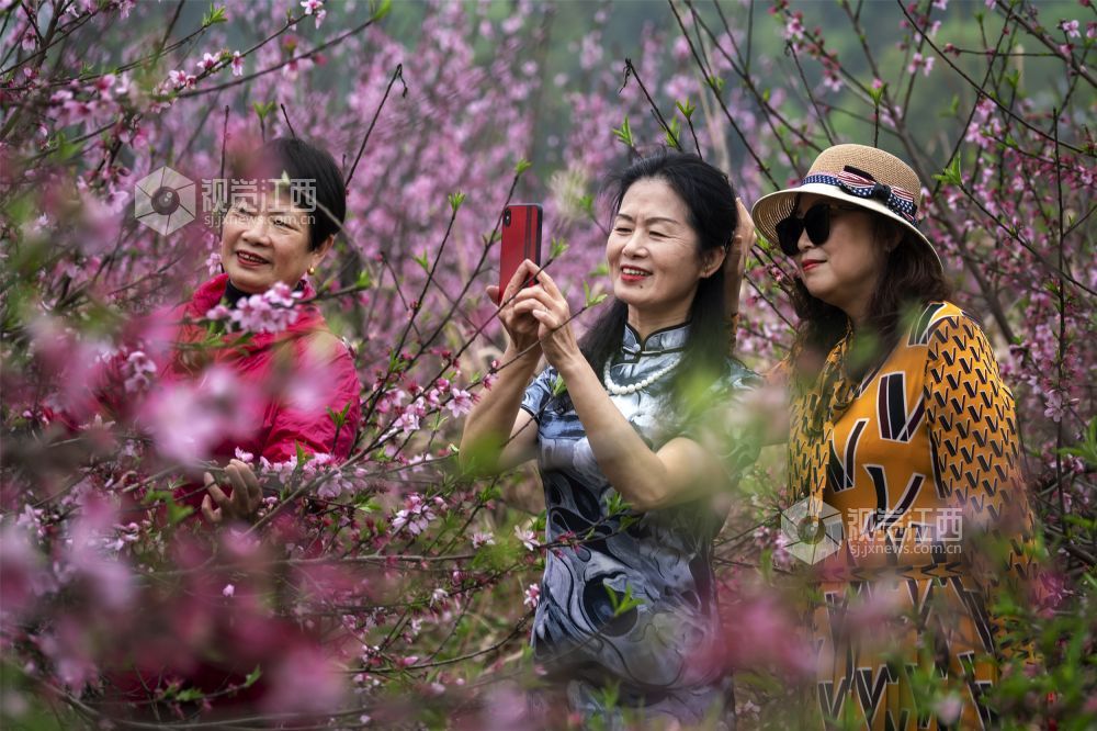 近日,江西省新余市仙女湖区昌坊村桃花基地里桃树竞相开放,盛开的桃花吸引大批游客前来赏花,享受美好的春日时光。