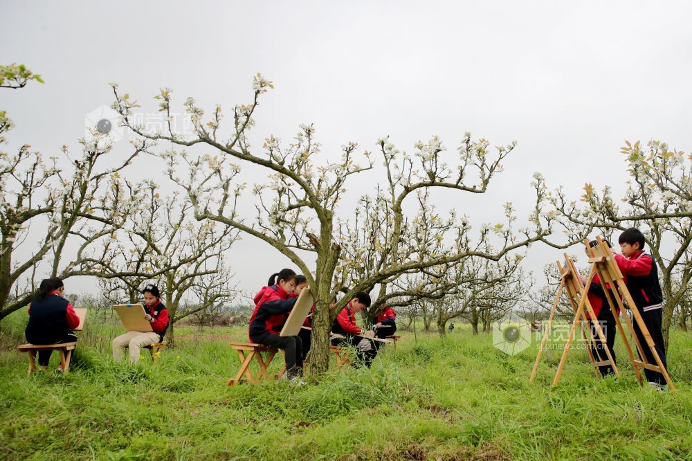 2021年3月19日,江西省吉安市峡江县金坪民族乡金坪中心小学的学生们在梨园里写生。