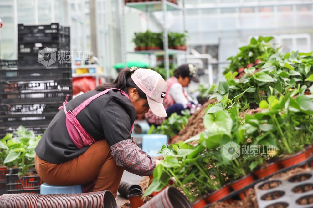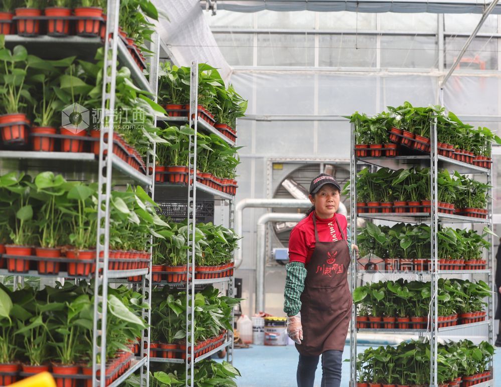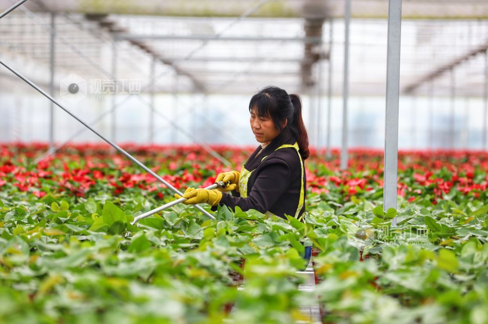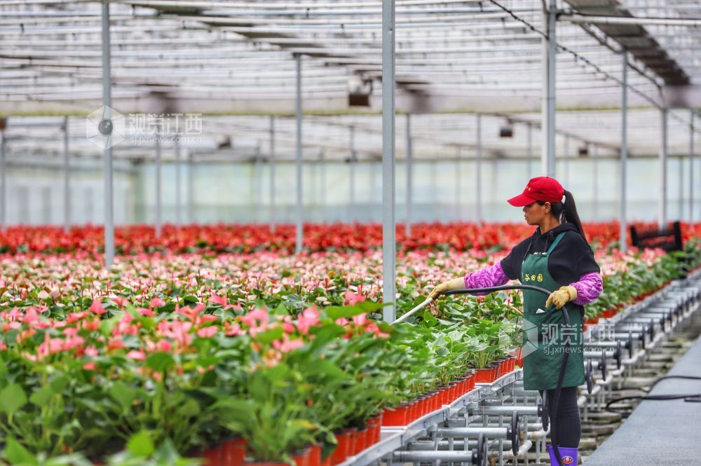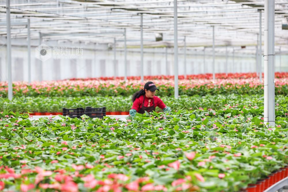 春暖花开时节,位于江西省九江市彭泽县浪溪镇现代农业示范园区的花卉种植基地智能温室大棚里一片繁忙景象。