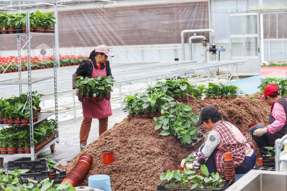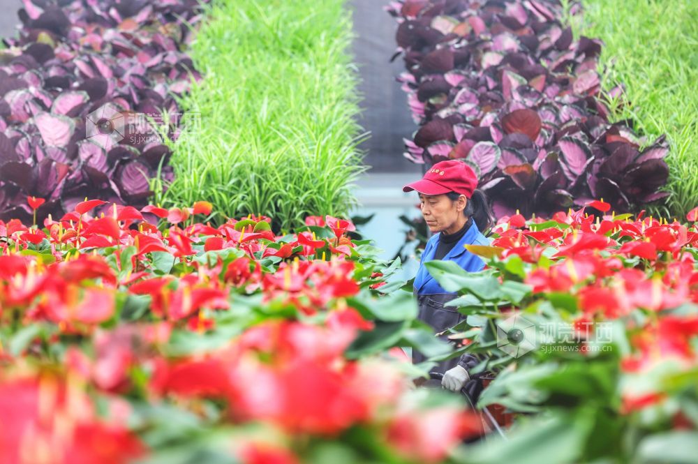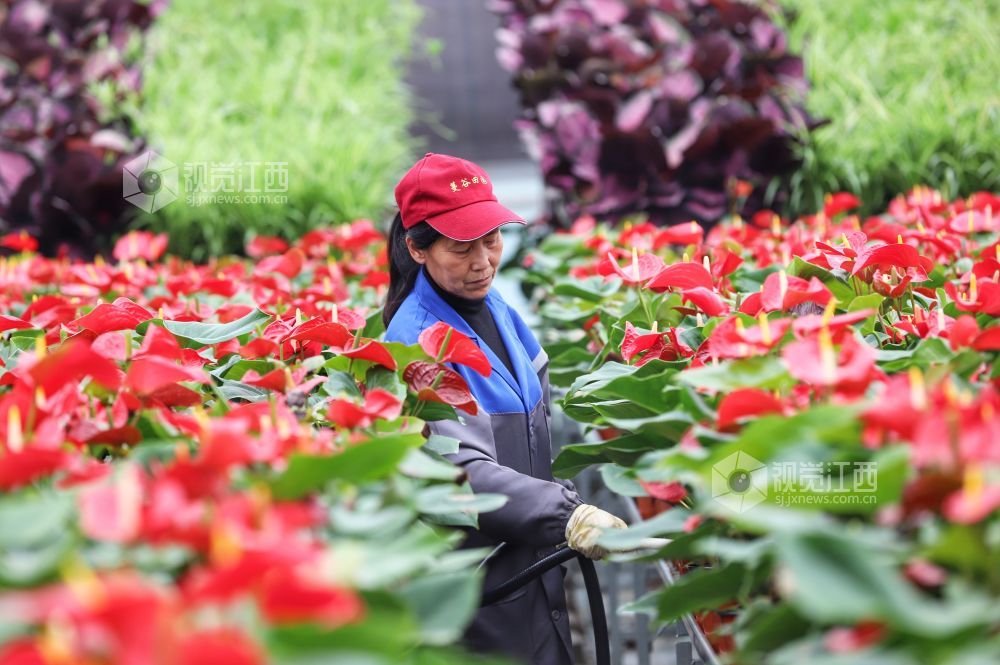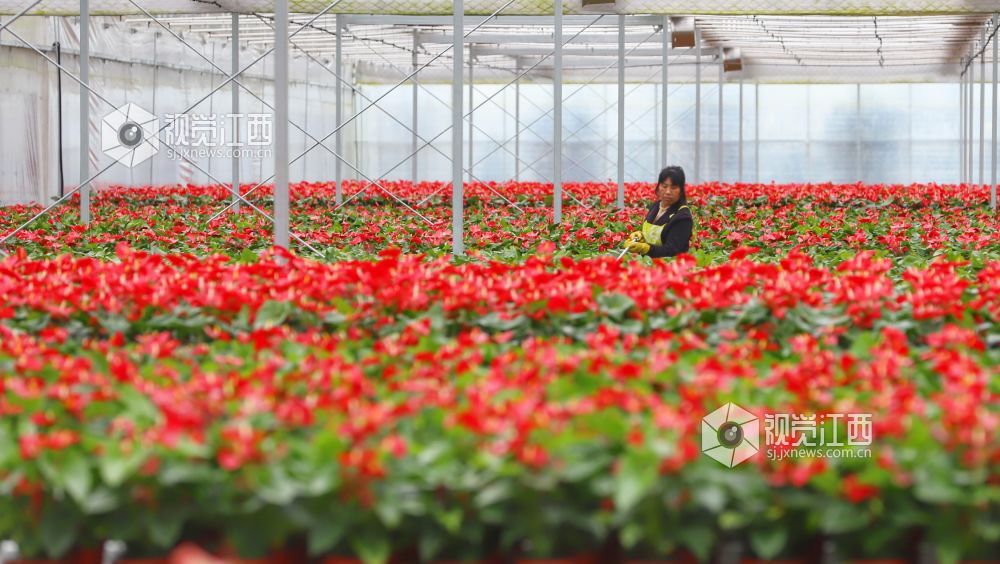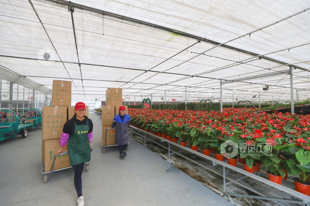 春暖花开时节,位于江西省九江市彭泽县浪溪镇现代农业示范园区的花卉种植基地智能温室大棚里一片繁忙景象。