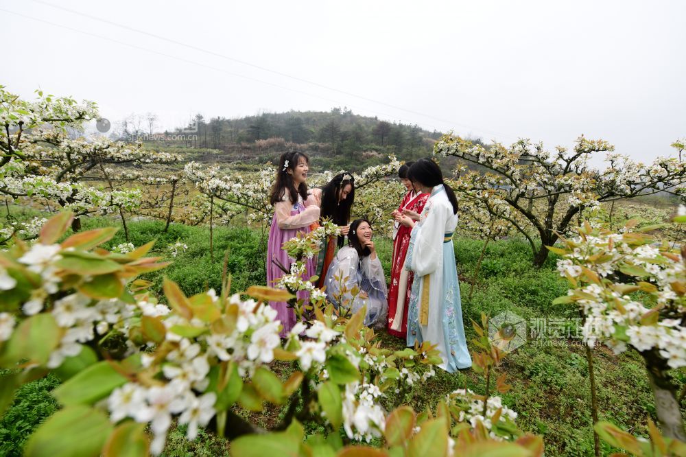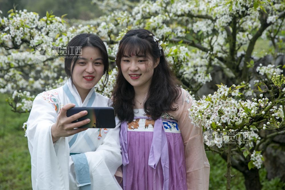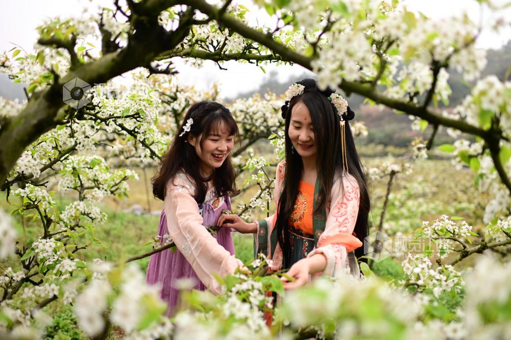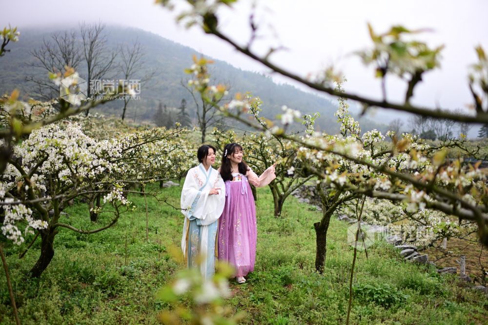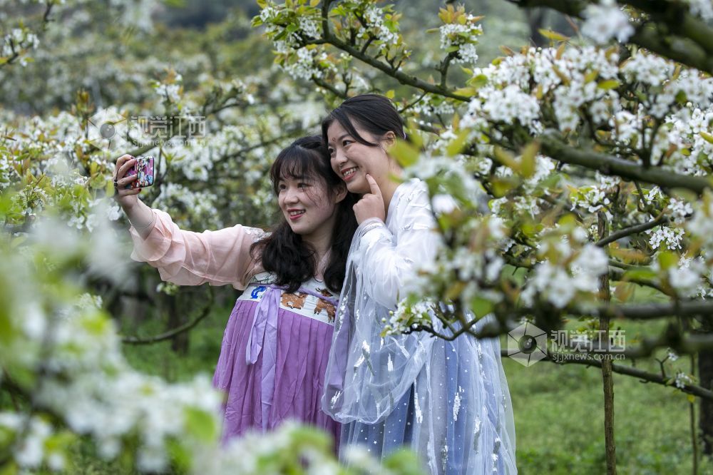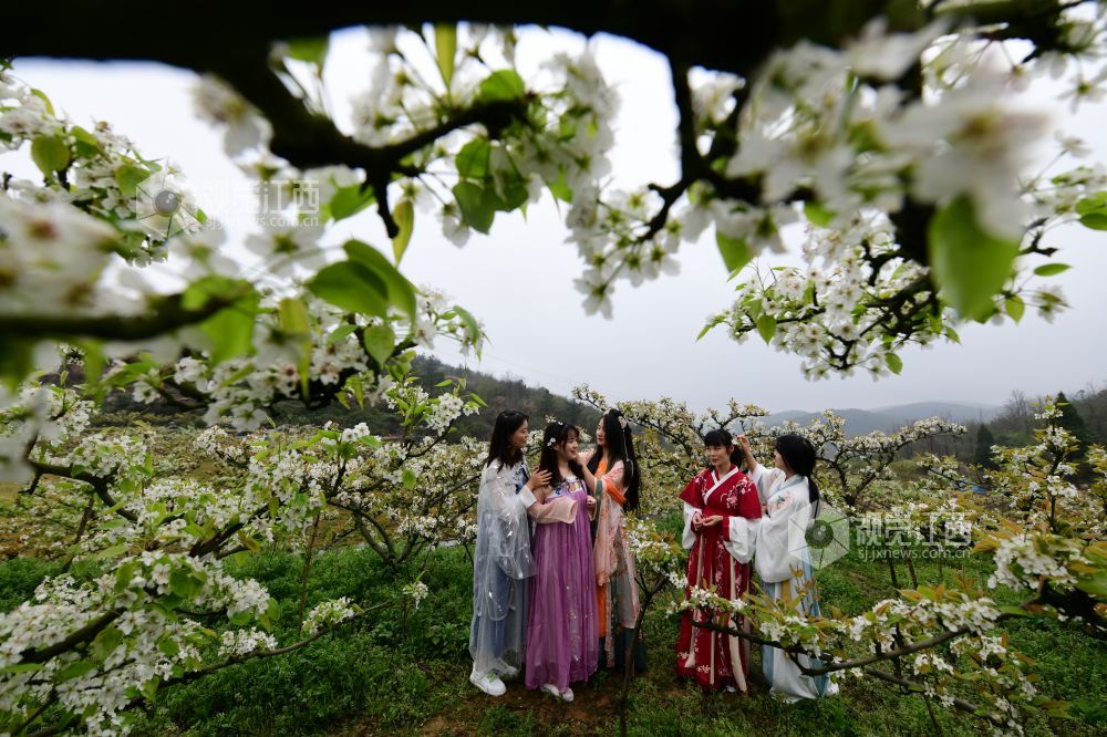 2021年3月19日,江西省瑞昌市横立山乡青岭村翠冠梨基地,游客在花海中赏花、游玩。