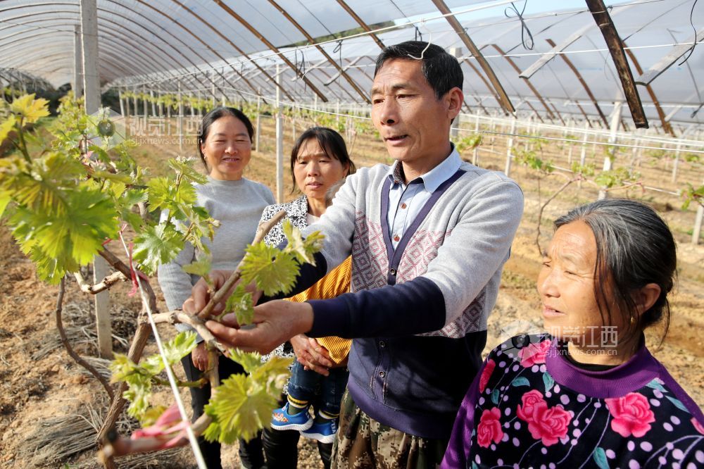2021年3月24日,在江西省吉安市峡江县罗田镇袁家移民新村,退役军人、党员袁菊根在为种植户传授葡萄种植技术。