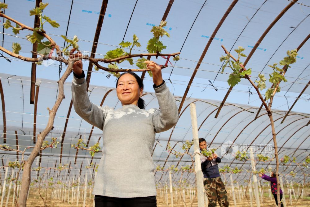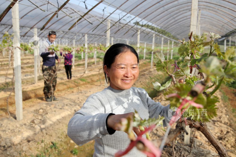 2021年3月24日,在江西省吉安市峡江县罗田镇袁家移民新村,种植户在葡萄园里劳作。