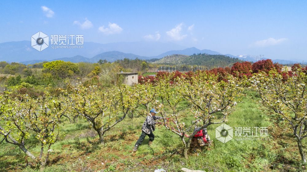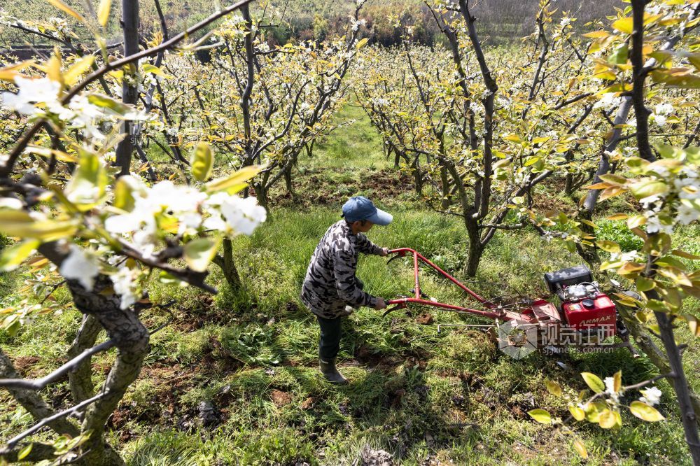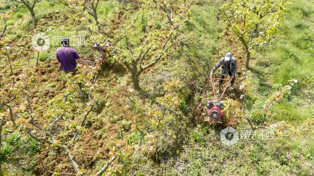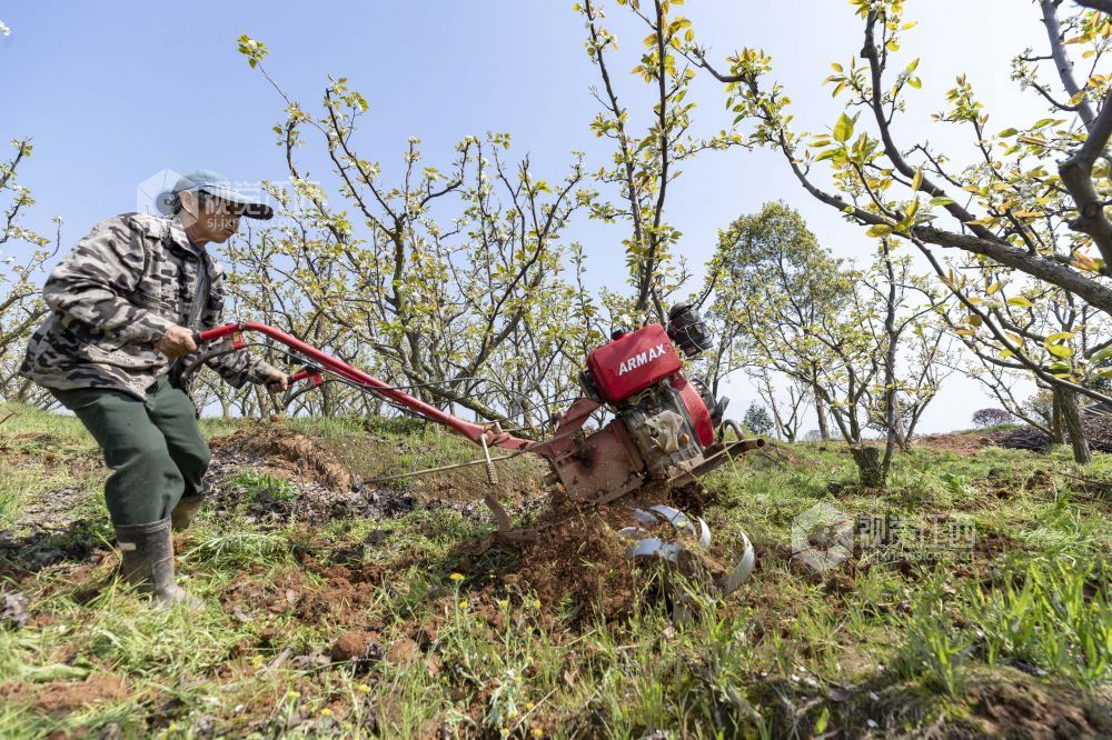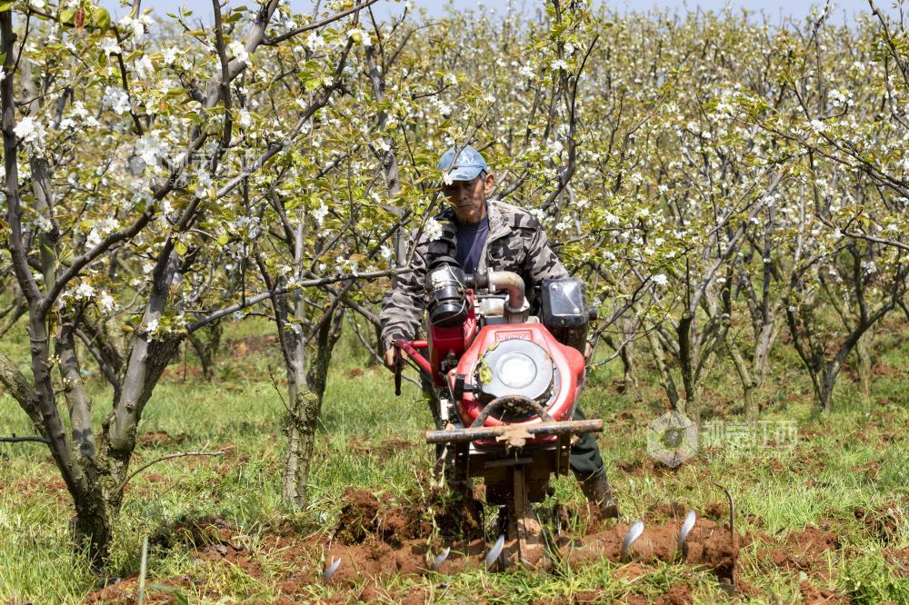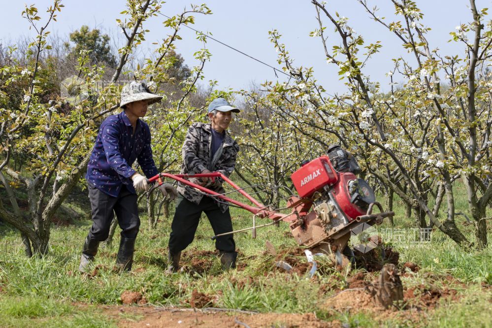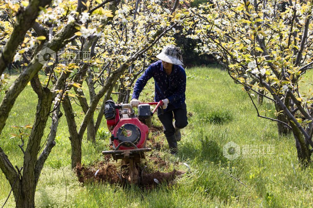 2021年3月24日,江西省庐山市星子镇三角垅村生态梨园,农民在给梨树翻土施肥。 通过“土地流转+专业合作社”模式,庐山市大力推广农业规模化经营、企业化管理,促进村级集体经济发展实现农业增产、农民增收,为实现乡村振兴奠定基础。