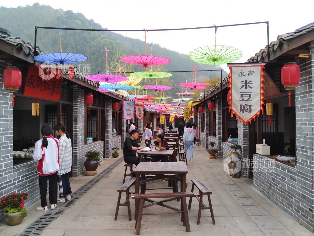 永新县曲白乡院下村距永新县城区35公里、距井冈山市12公里,是一个拥有几百年历史底蕴的古村落,建筑风格为赣派古村落民居。院下景区突出特色小吃、传统文化、休闲度假、群团演艺、儿童游乐等项目,已形成“吃住行游娱购”为一体的特色旅游景点,也渐渐成为永新市民及周边游客的网红打卡地。游客来到这里,不仅能品尝到极具特色的当地美食,而且能欣赏到书法作品展示及传统油纸伞制作工艺,让游客们体味到浓厚的文化气息。