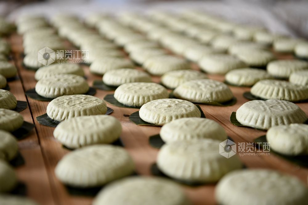 2021年3月28日,在江西省上饶市铅山县河口镇一居民家里正在制作清明果。