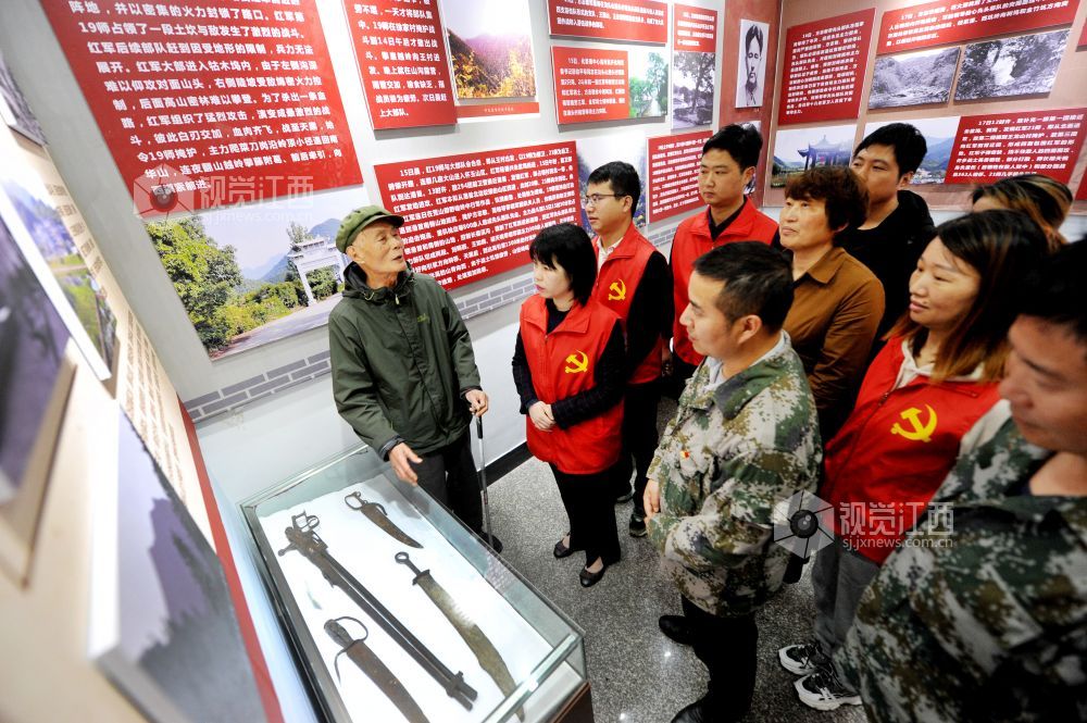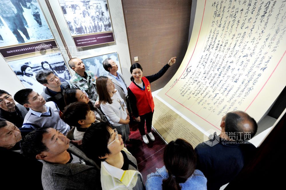 2021年4月3日,江西省德兴市花桥镇村镇两级党员干部在共产主义劳动大学记忆馆,现场接受和观看有关党史教育图片展。