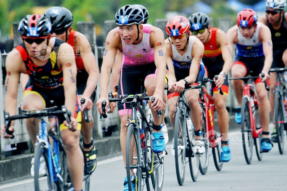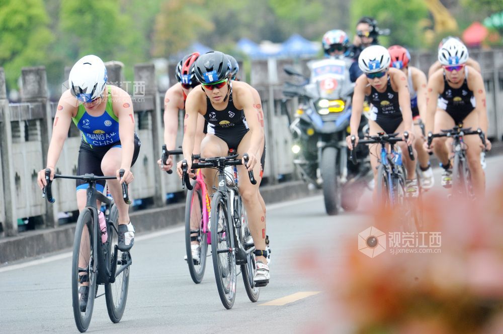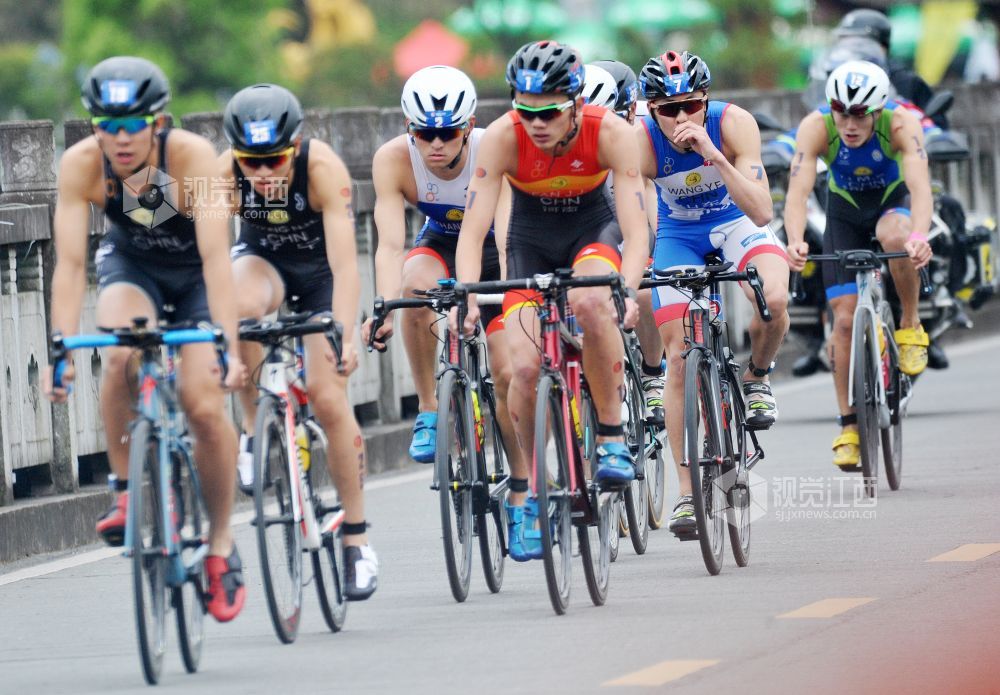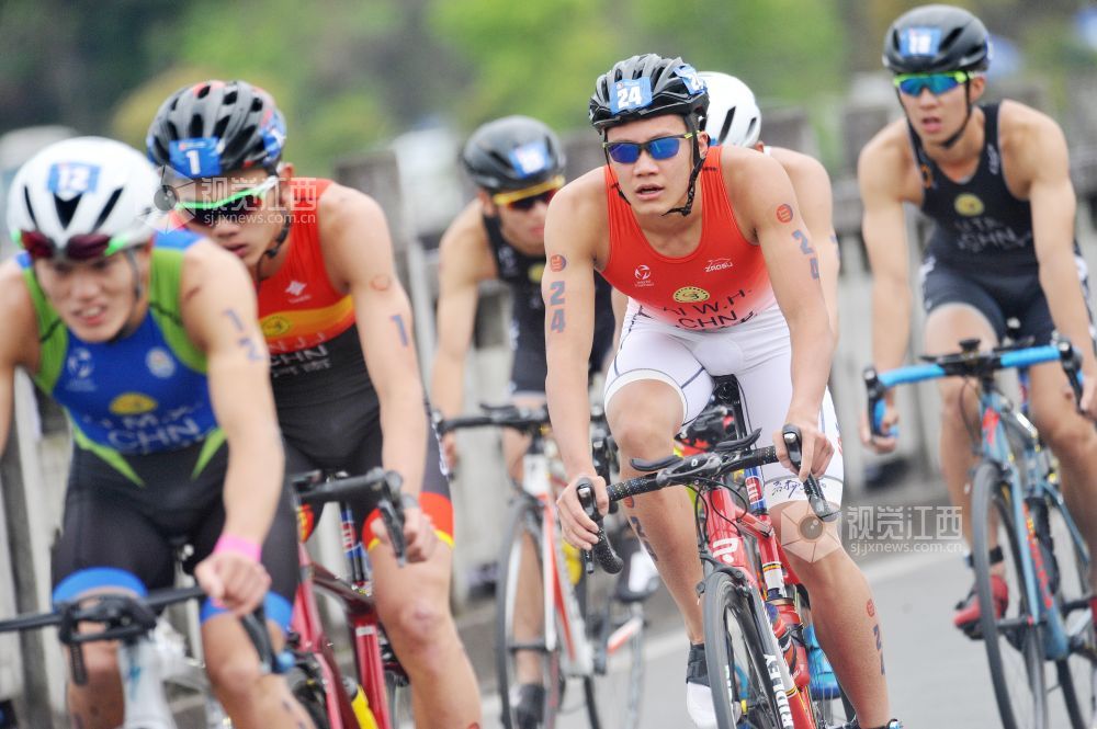 2021年4月10日,参加中国铁人三项联赛暨全国冠军杯赛-江西德兴站的男子优秀选手正在进行第二项自行车比赛段时的镜头。