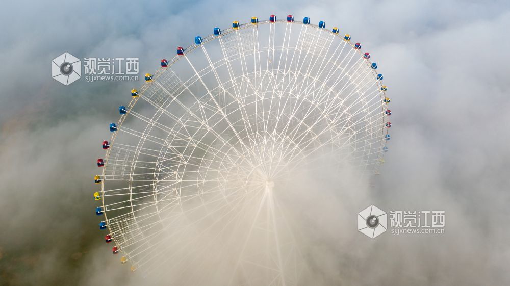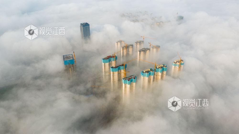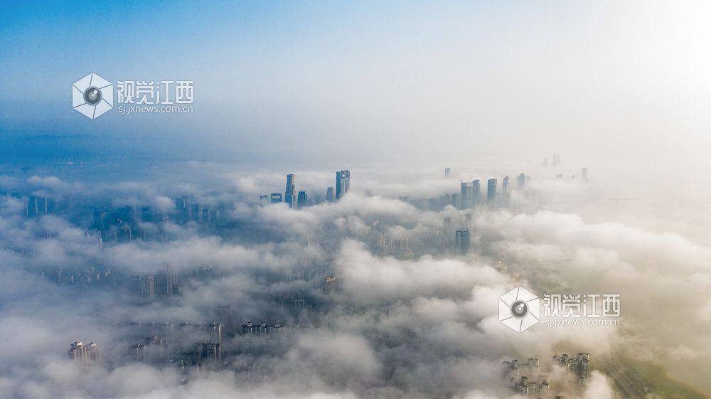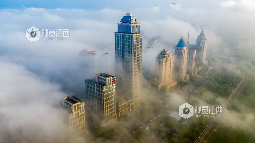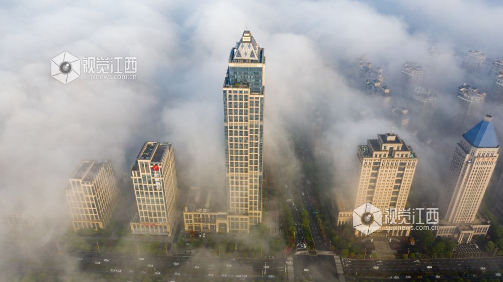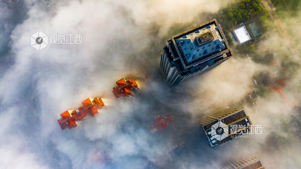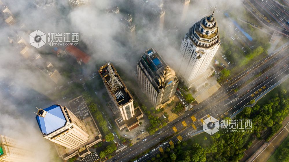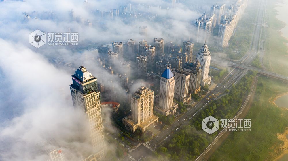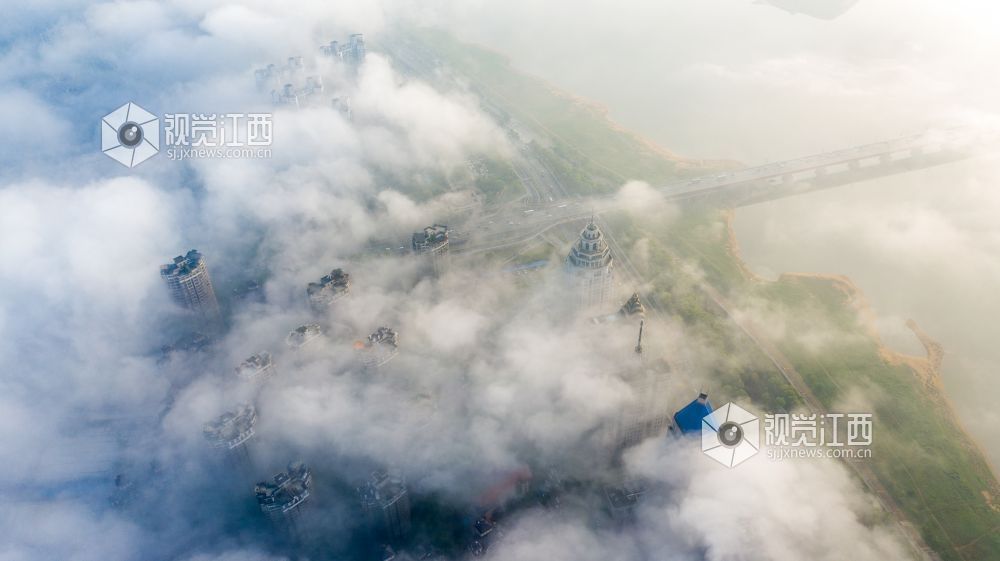 2021年4月13日,江西省南昌市出现大雾天气,从空中俯瞰各种建筑若隐若现,仿佛仙境一般。