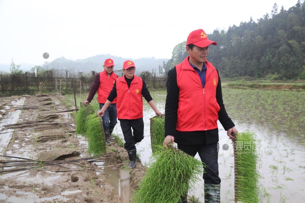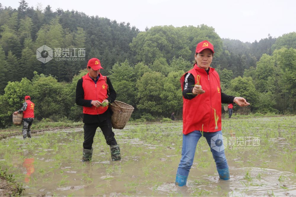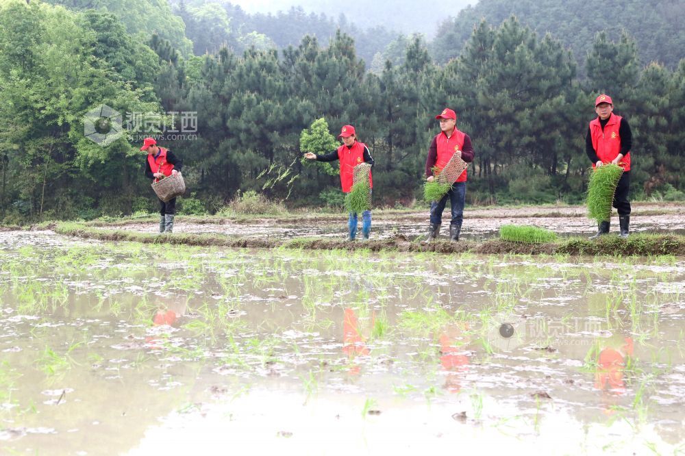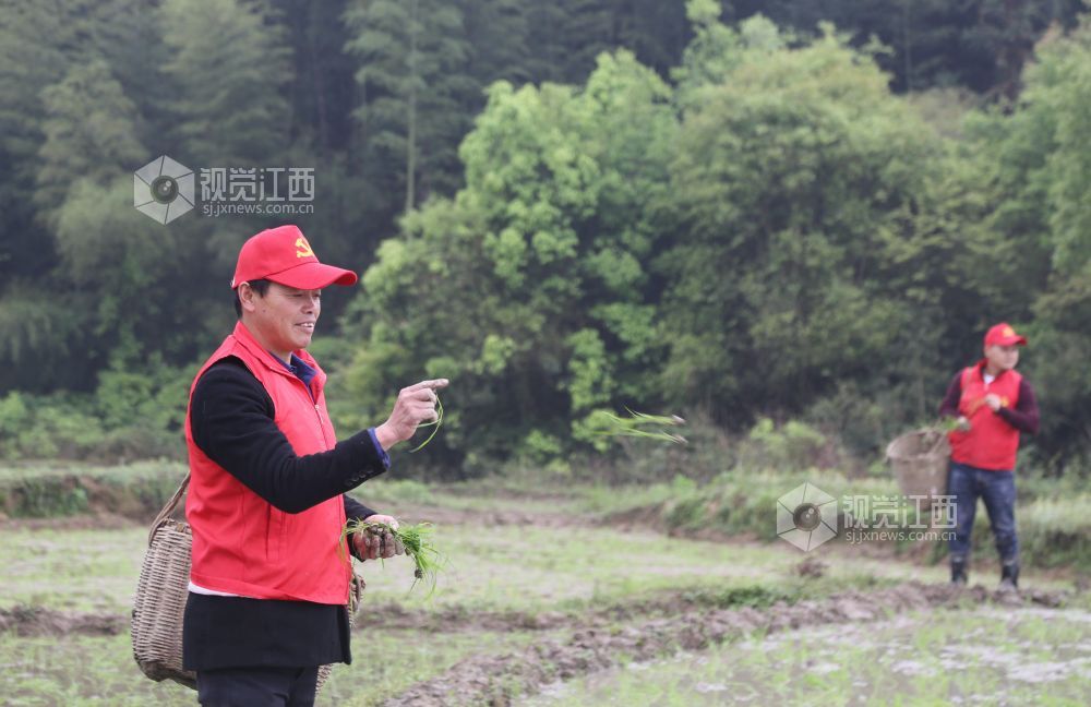 2021年4月7日,江西省吉安市峡江县戈坪乡党员志愿者帮助劳动力缺乏的特殊人群家庭农民抛秧,确保不误农时,获得丰收。