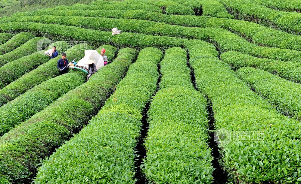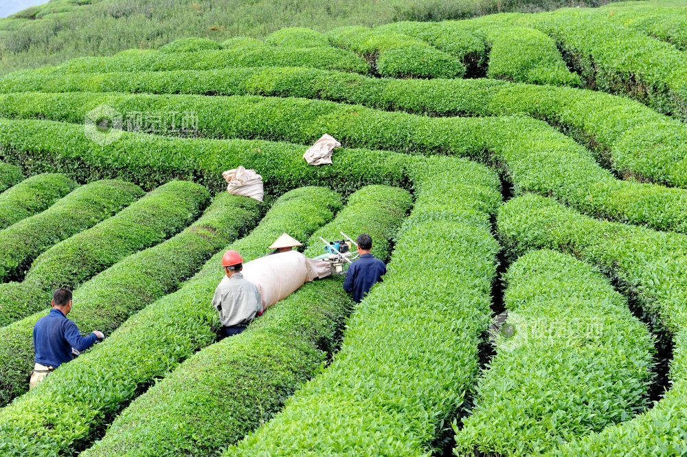2021年4月17日,江西省德兴市绕二镇重溪村,茶农正在千亩高山茶基地机采谷雨茶。