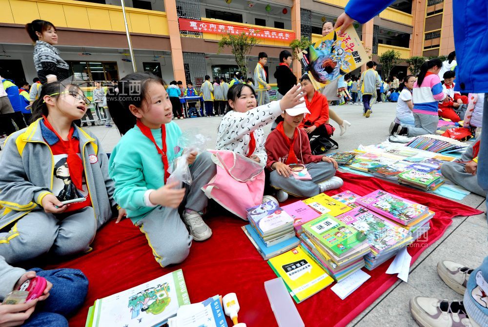 2021年4月20日,江西省德兴市一小学学生正在校园“跳蚤书市”售卖自己闲置的书籍。