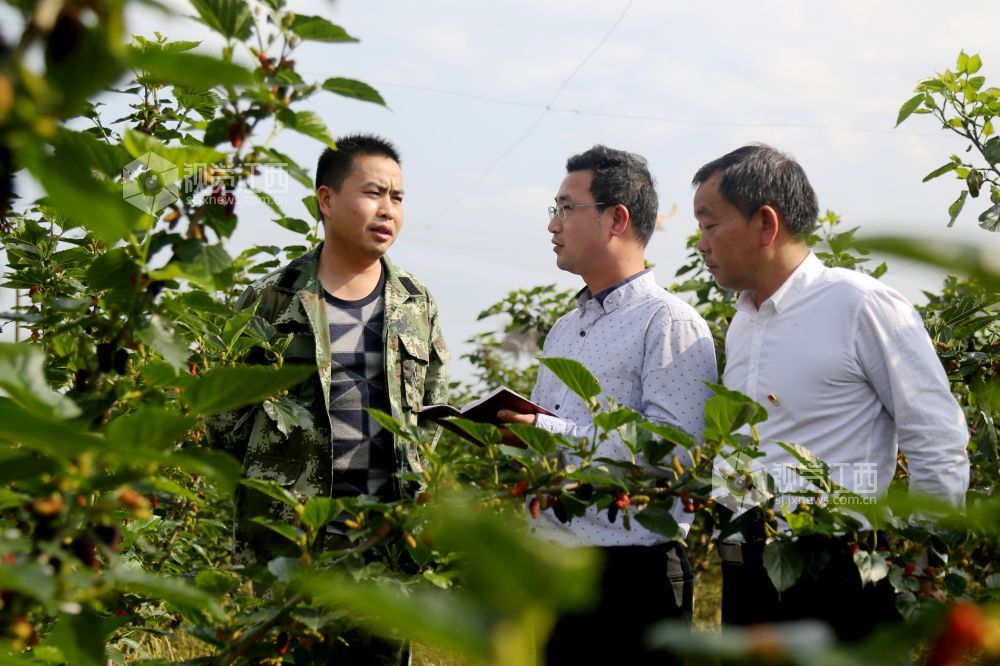 2021年4月22日,在江西省吉安市峡江县金坪民族乡新民村桑葚种植基地,该乡党员干部在向村民了解果业种植技术和信贷需求。