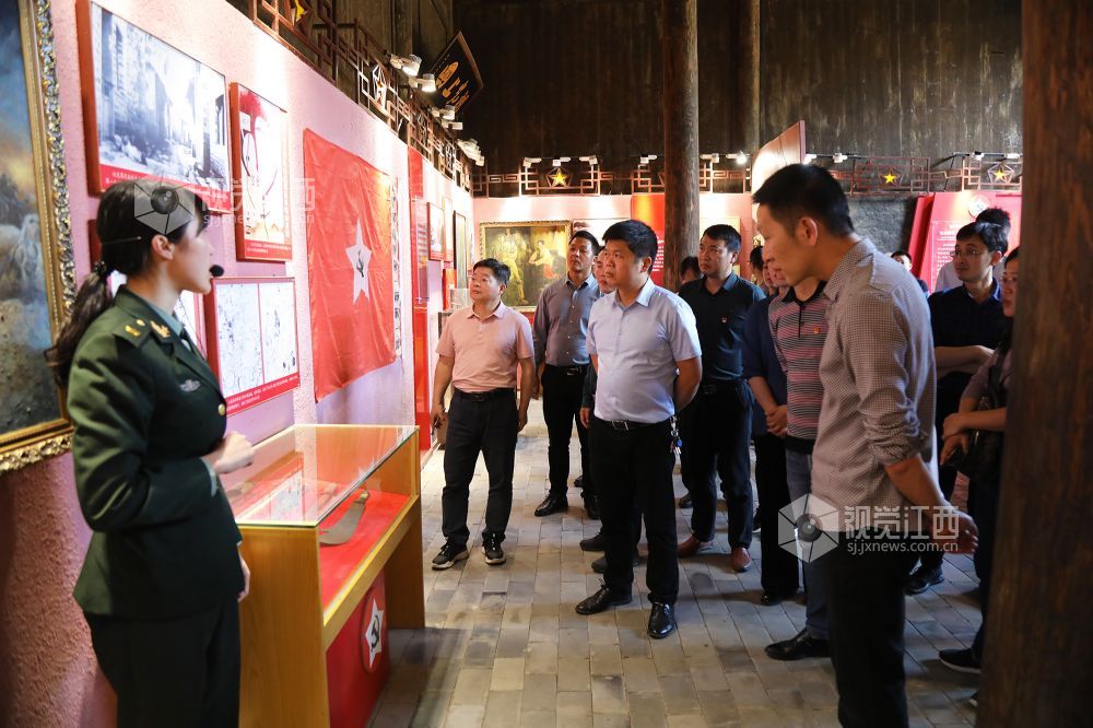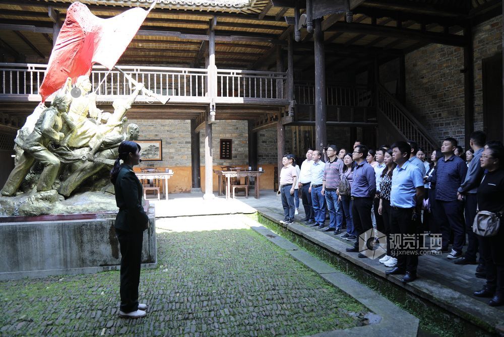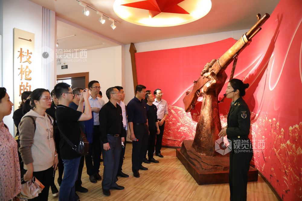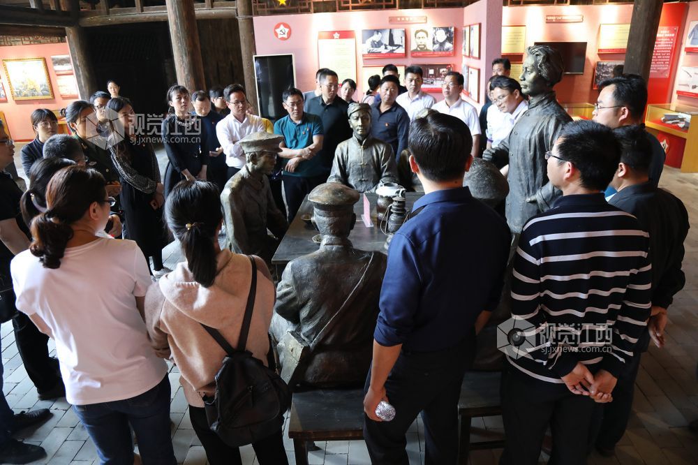4月29日,江西省莲花县宾兴馆,游客在聆听讲解员讲解秋收起义和莲花一支枪的故事。