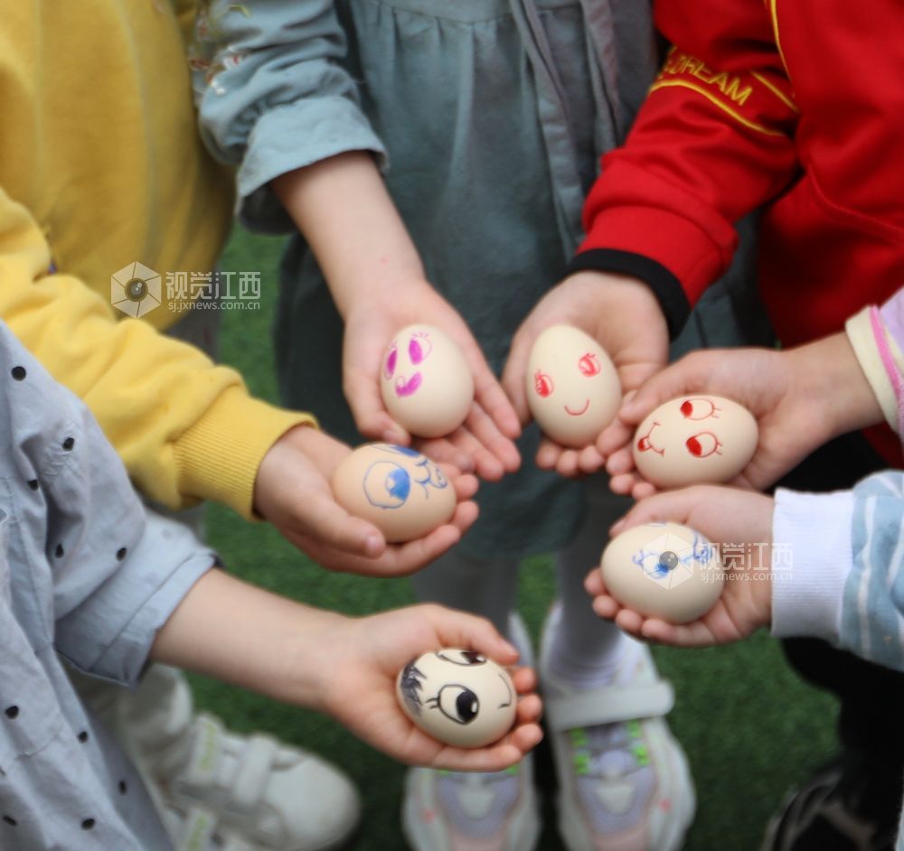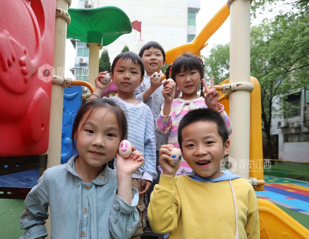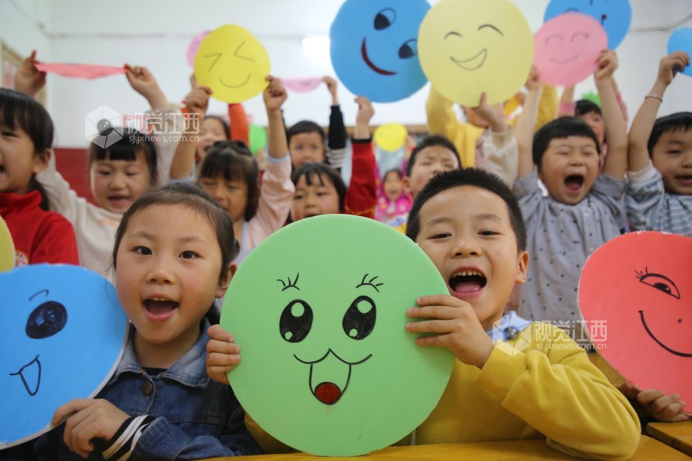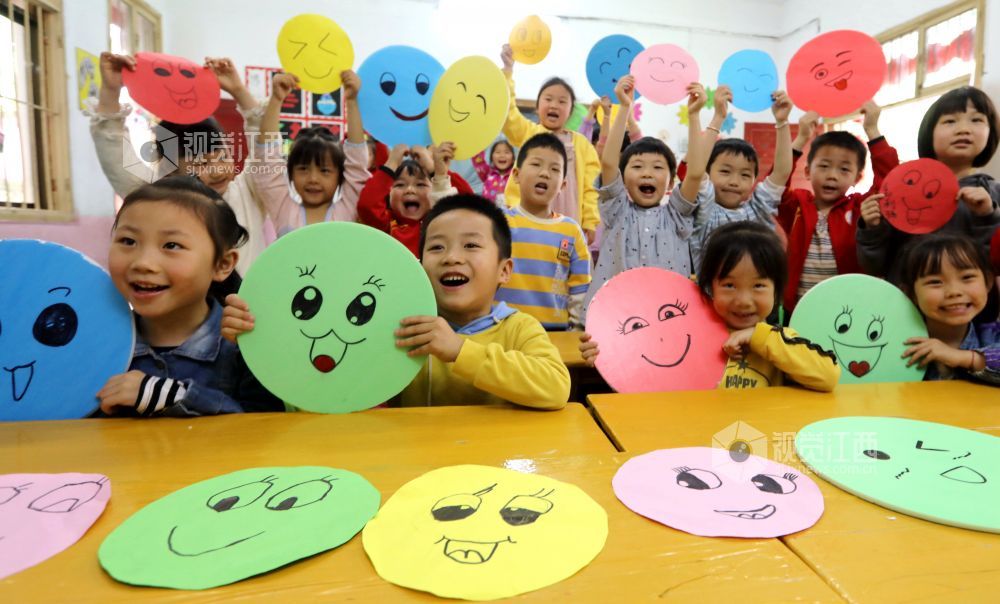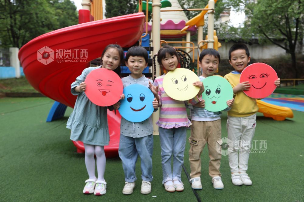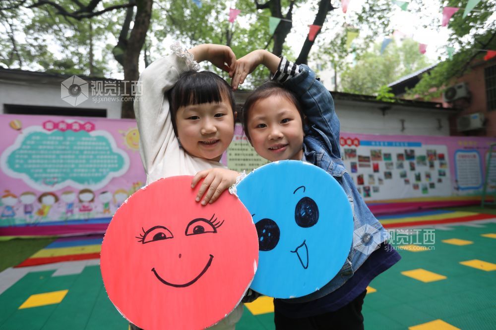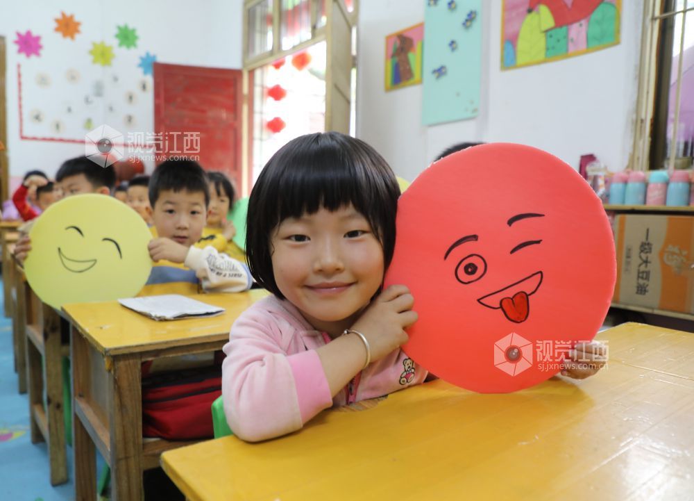 2021年5月8日,江西省吉安市峡江县阳光幼儿园大班的小朋友们正在展示绘制的“笑脸”。