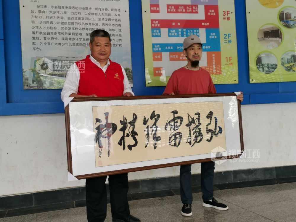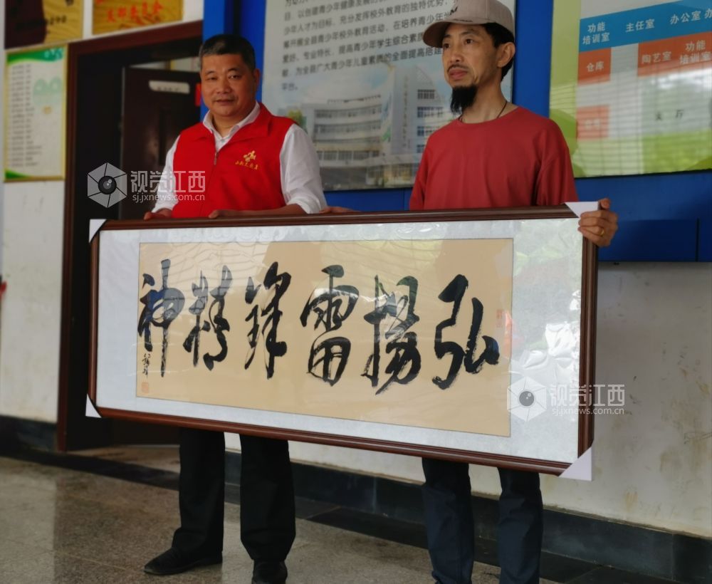 2021年5月8日下午,江西永新本土书法艺人罗银祥将一幅写有“弘扬雷锋精神”的书法作品赠送给永新县志愿者协会。