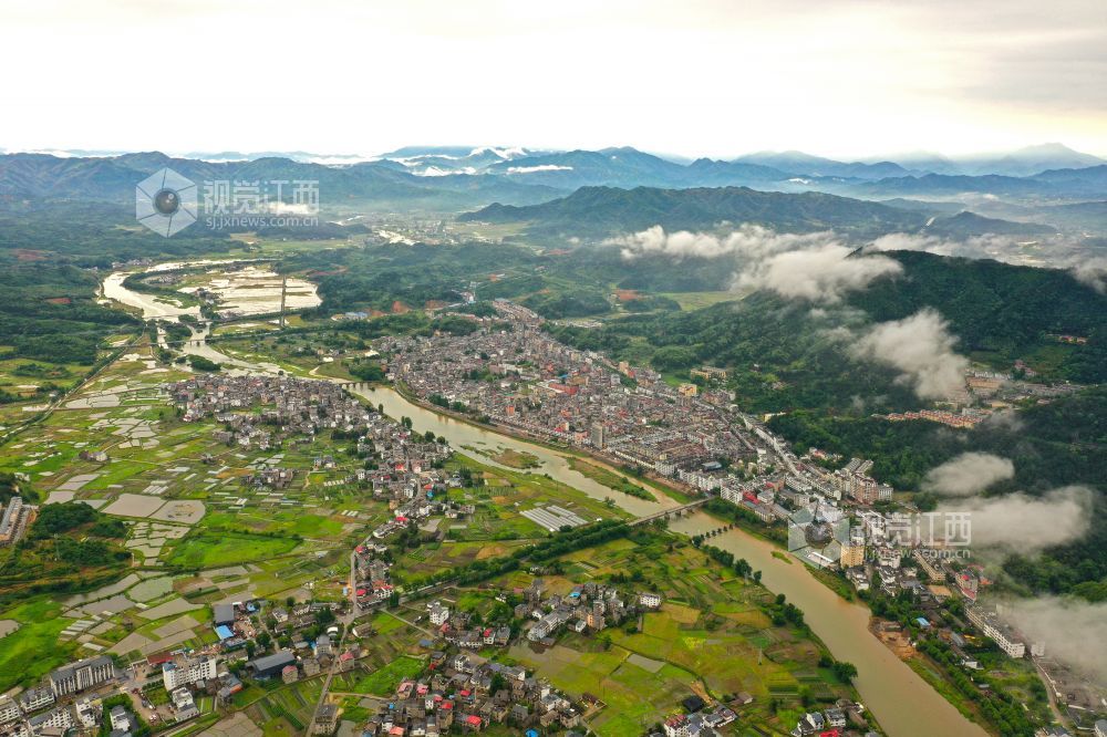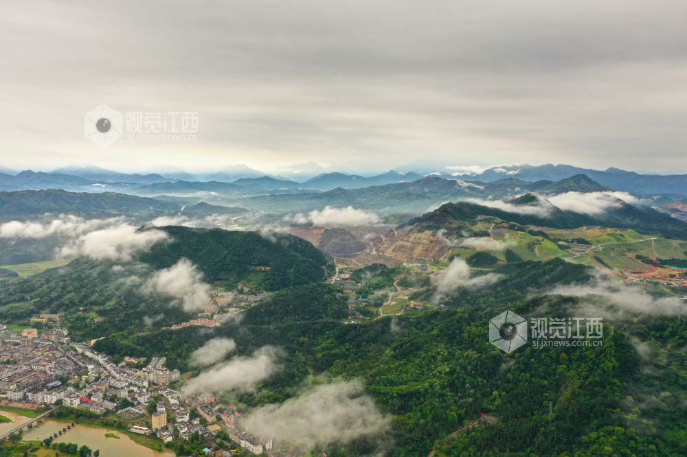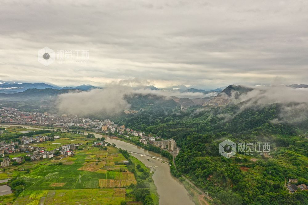2021年5月11日,航拍江西省上饶市铅山县永平镇暴雨过后云雾缭绕景观,云卷云舒。