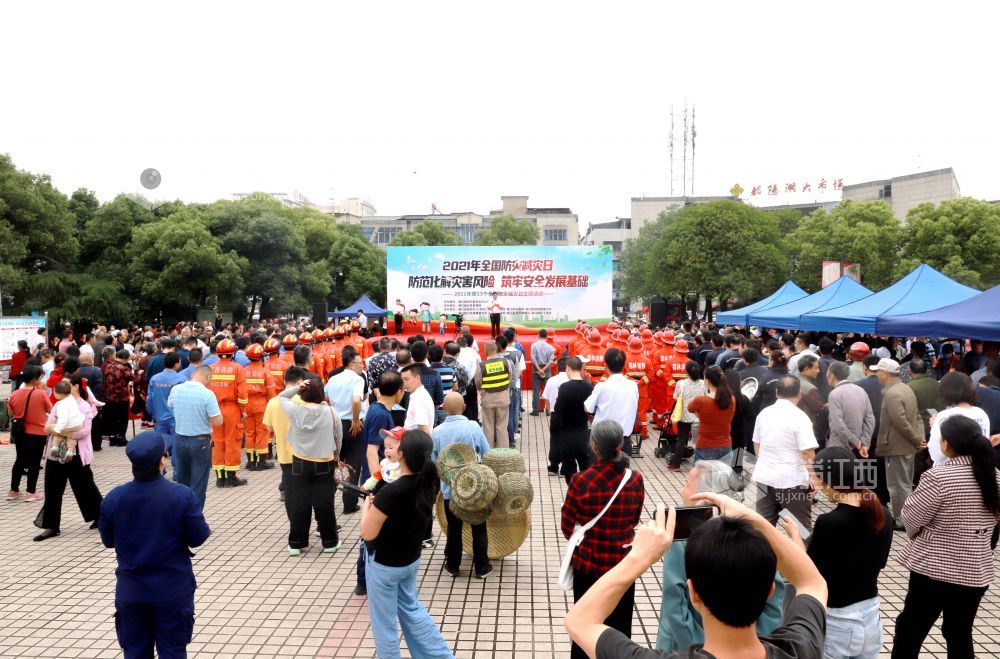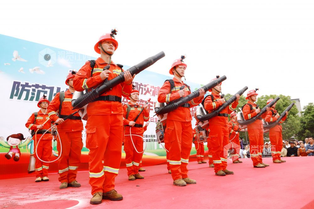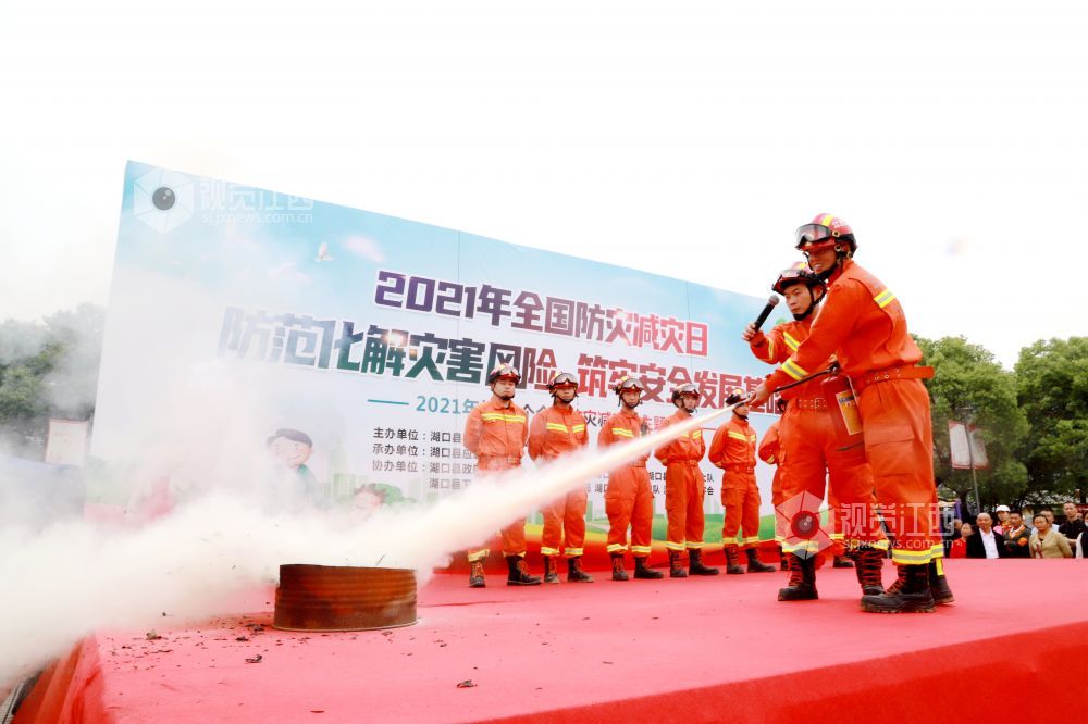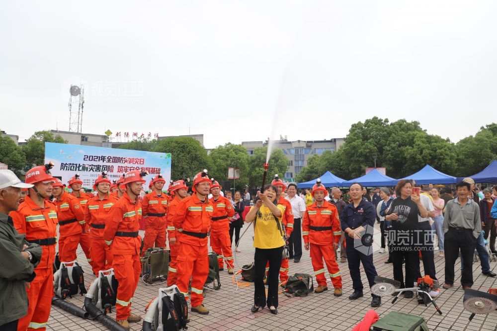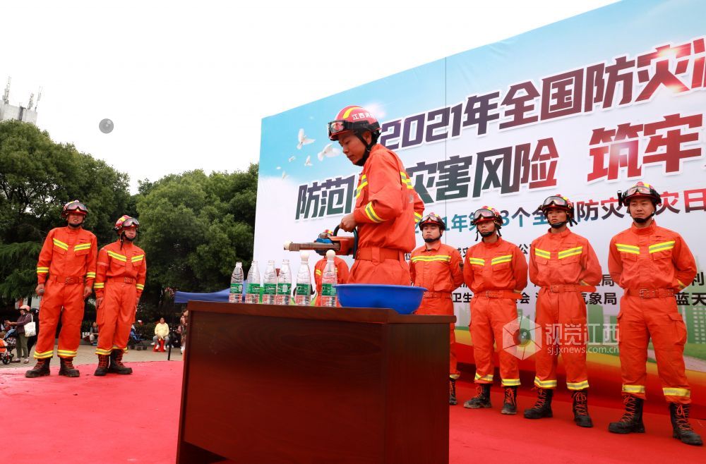 2021年5月12日,在江西省九江市湖口县2021年第13个全国防灾减灾日主题活动中,消防队员正演示灭火器、液压钳等器材,面向群众普及自然灾害及灾害发生时防灾减灾、应急自救等知识,提升防灾减灾救灾能力。