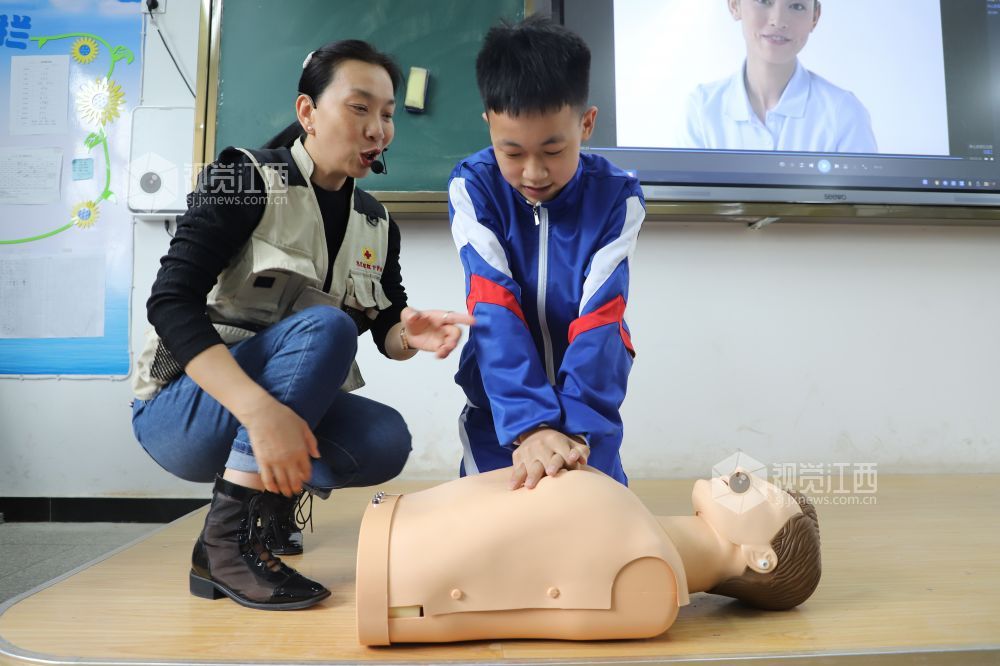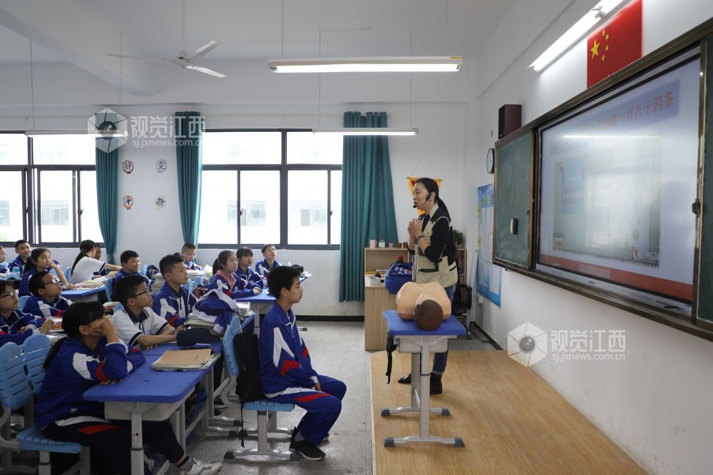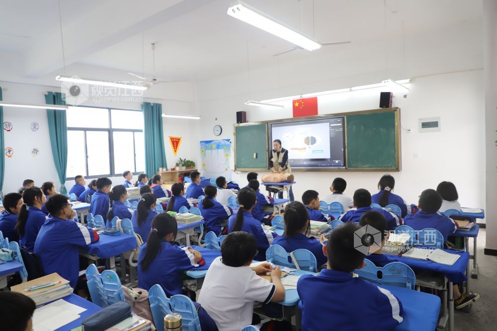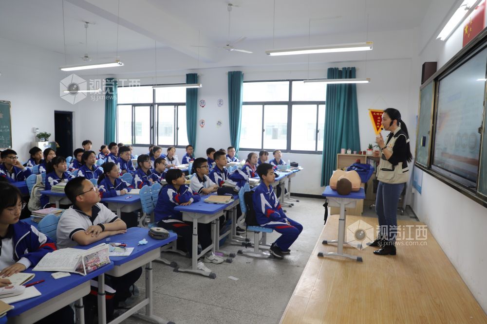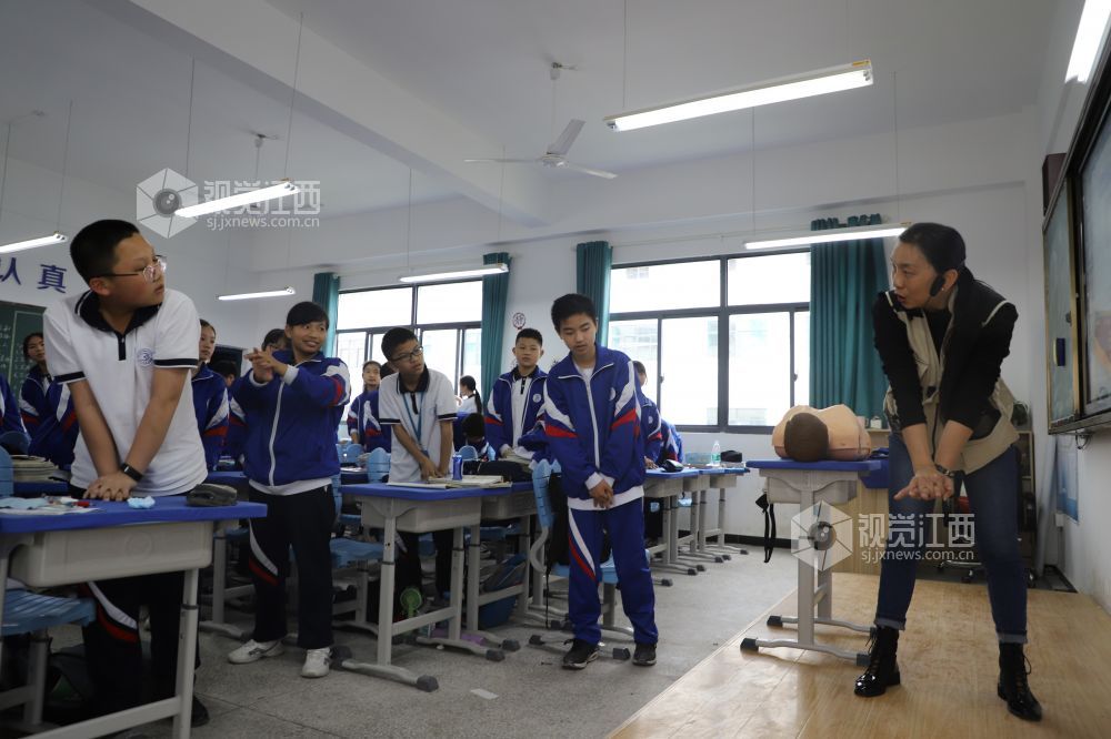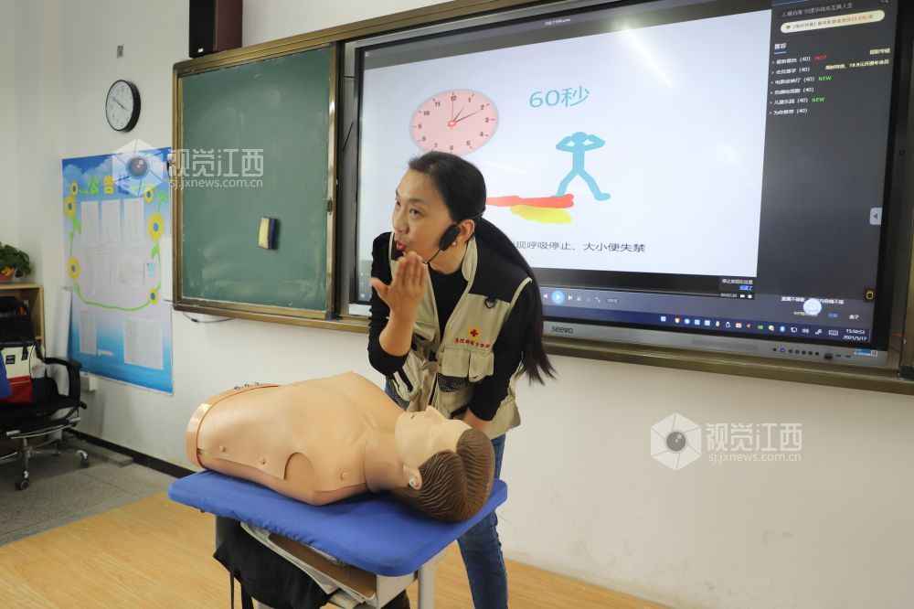2021年5月17日,江西省九江市红十字会专业教师给湖口县第三中学学生讲授心肺复苏等急救常识技能,增强学生紧急避险和自救互救的意识和能力。