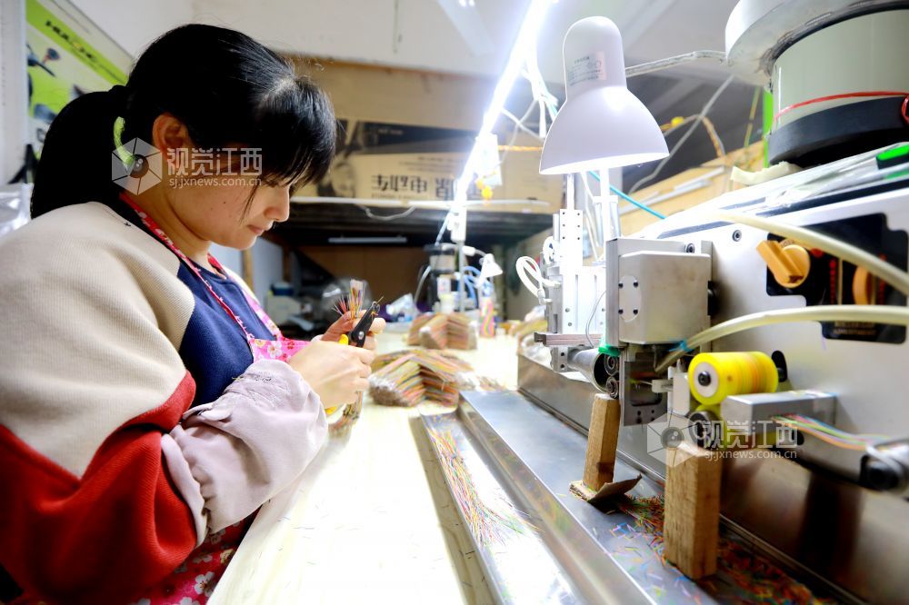 2021年5月18日,在江西省吉安市峡江县巴邱镇一家社区工厂,留守妇女在制作电源线。