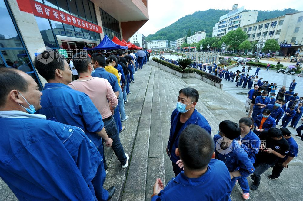 2021年5月21日,在江西省德兴市铜矿街道办社区接种新冠疫苗现场,市民排队有序接种。