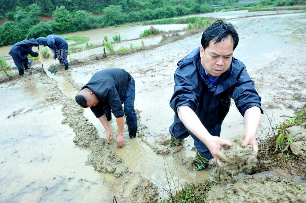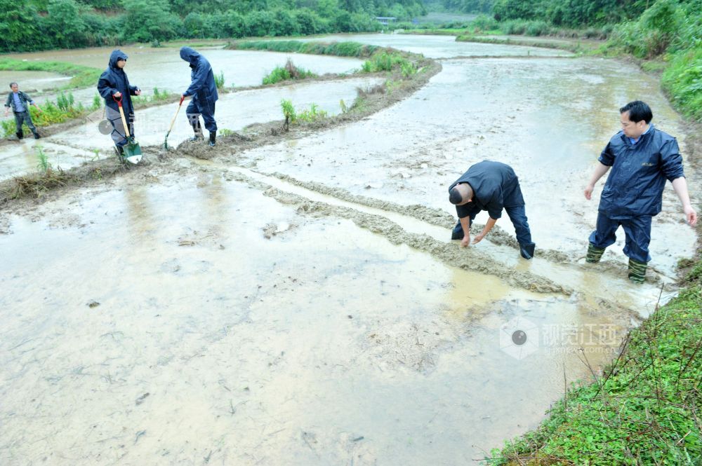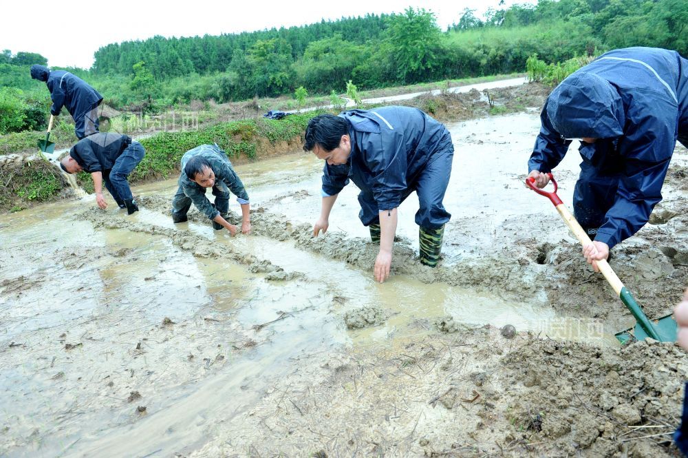 2021年5月23日,江西省德兴市香屯街道办党员干部正在当地兰墩村帮助该村种粮大户刘和兵刚刚直播下田的水稻挖沟排水。