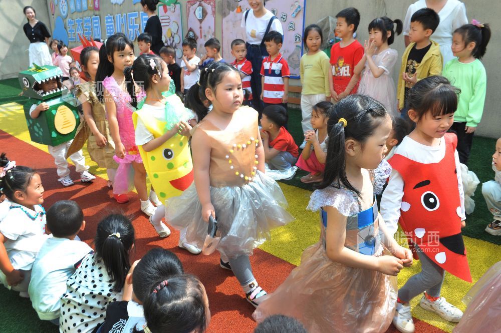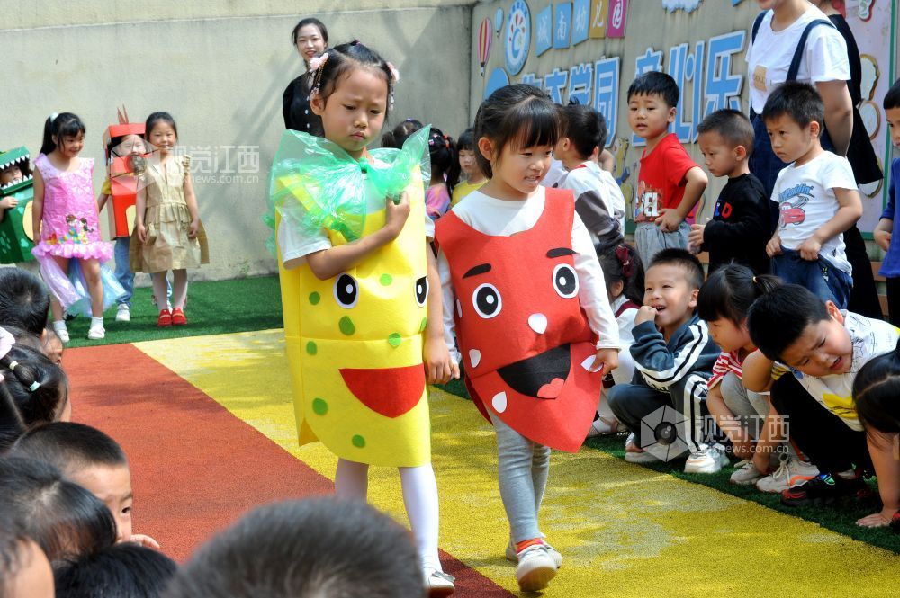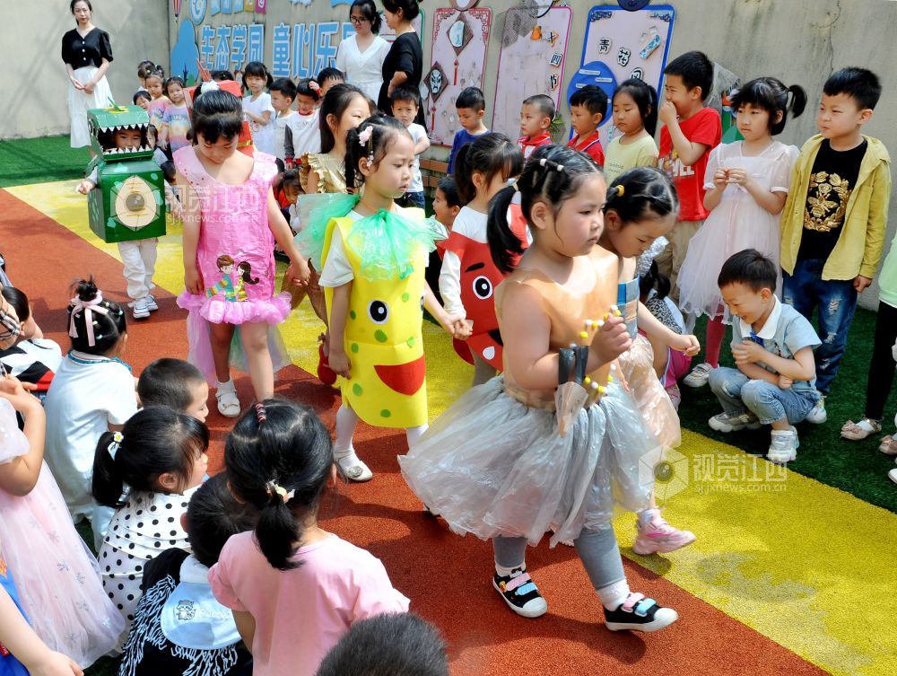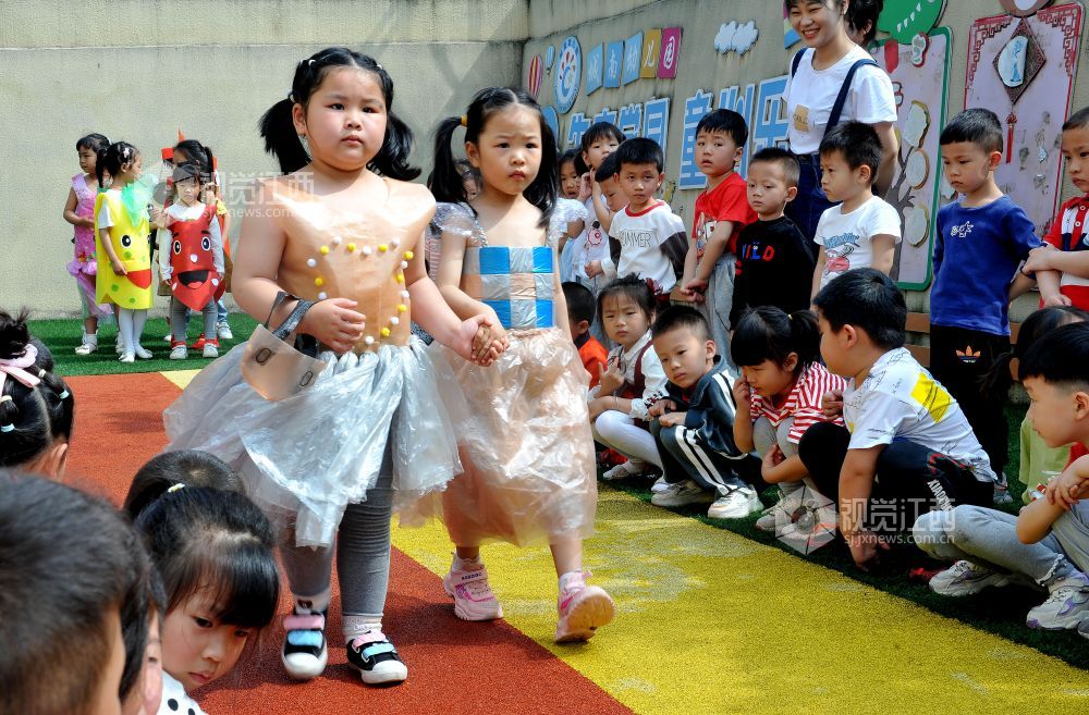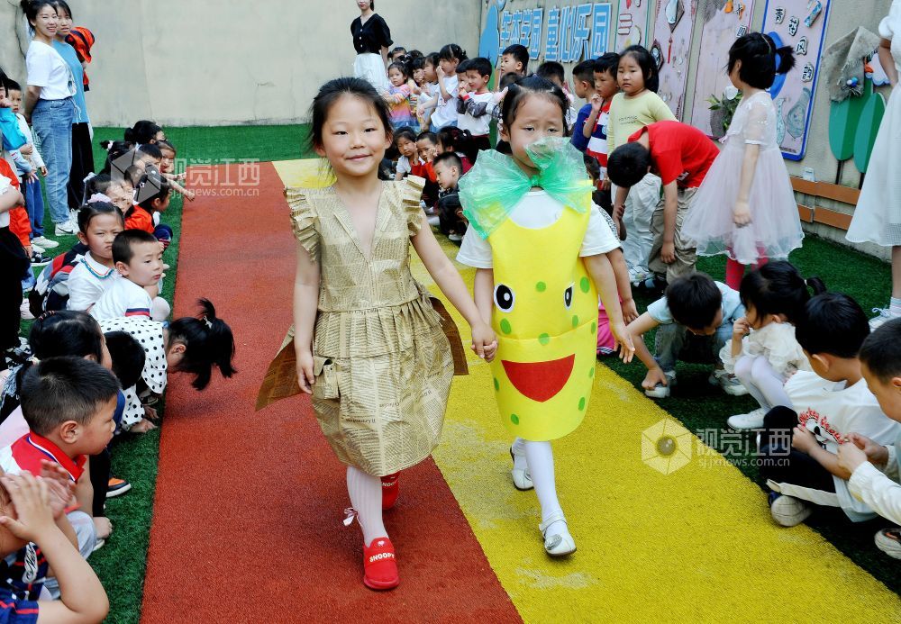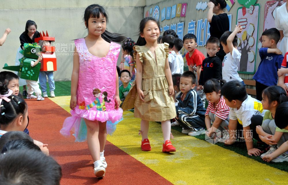 5月25日,江西省德兴市城南幼儿园小班的小朋友穿着由塑料带和扑克牌制作的“时装”现场走秀。