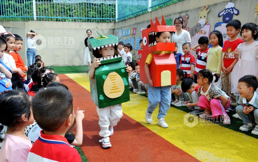 当天,江西省德兴市凤城南幼儿园开展了一场幼儿环?!笆弊啊毙悖迷暗男∨笥言诶鲜Φ陌镏傅枷?,利用家里的废纸壳、废塑料、废报纸等物品,制作成环保“时装”、机器人和贴画等作品予以现场展示,倡导珍爱家园、树立环保意识,并以此迎接“六一”国际儿童节的到来。