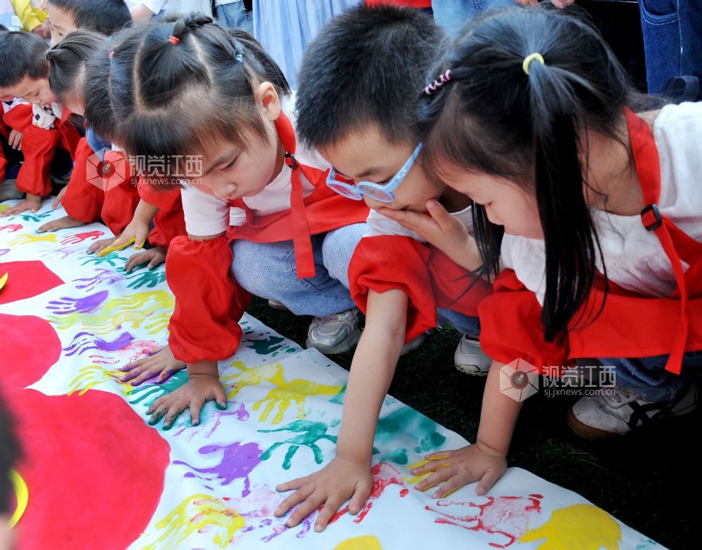2021年5月25日,江西省德兴市城南幼儿园中班的小朋友正在按下五彩手掌印,喜迎中国共产党百年华诞。