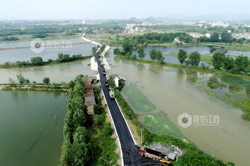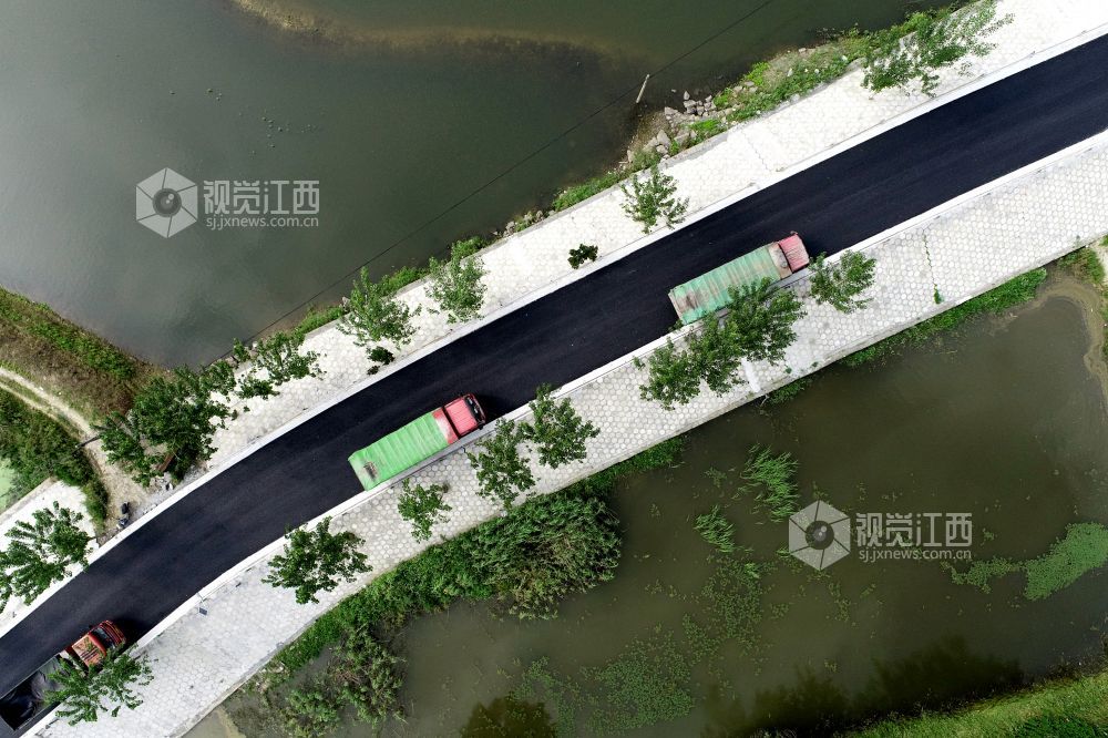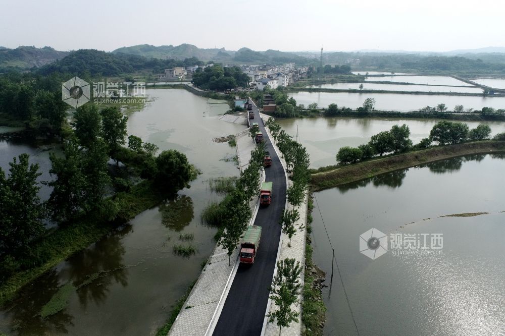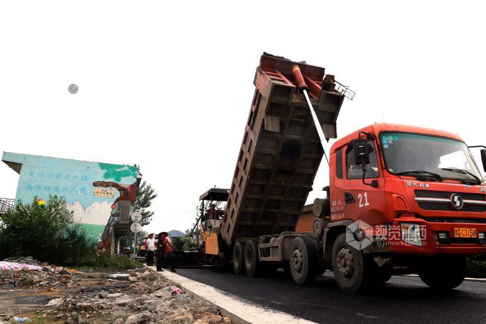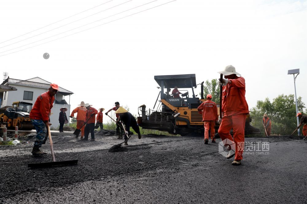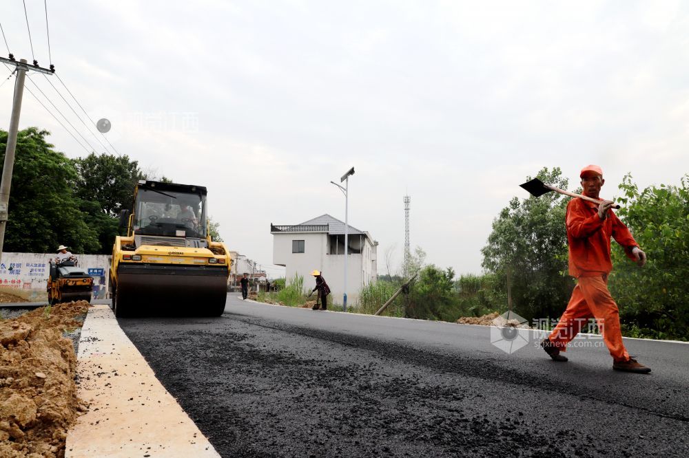2021年5月25日,在江西省九江市湖口县马影至江桥县道水毁重建项目施工现场,运输车辆来往穿梭,摊铺机正在摊铺沥青,压路车来回压实路面,施工人员忙着将沥青均匀地填满道路各个角落,一派繁忙景象。