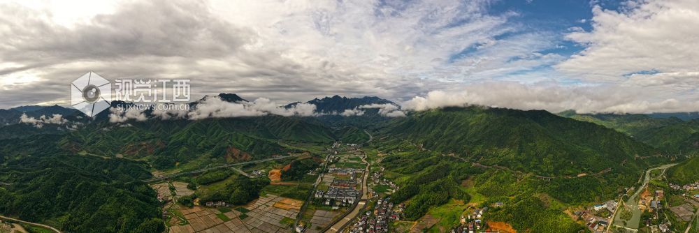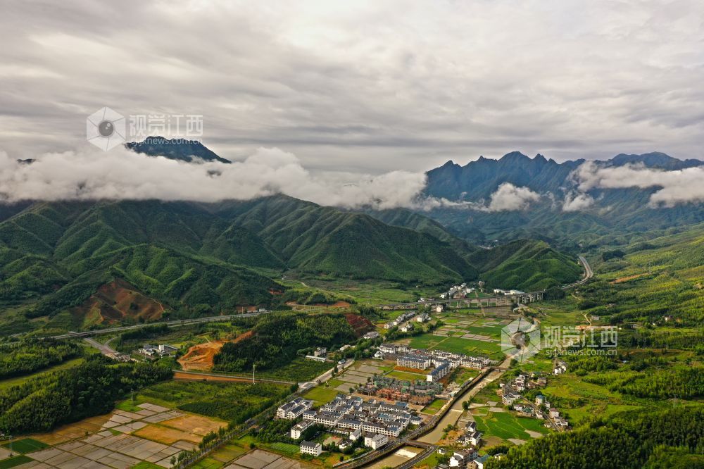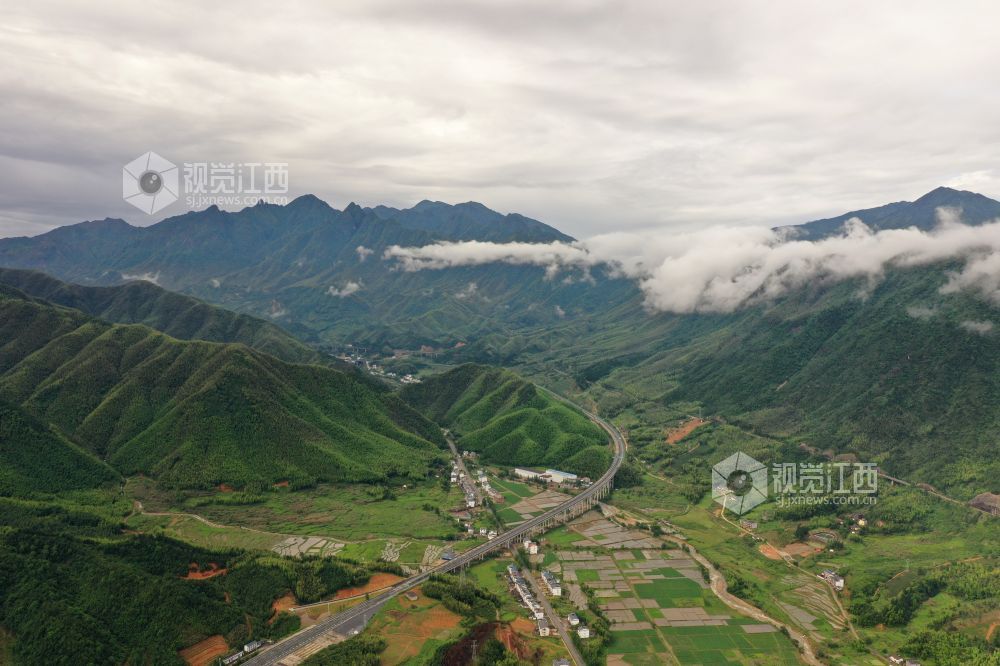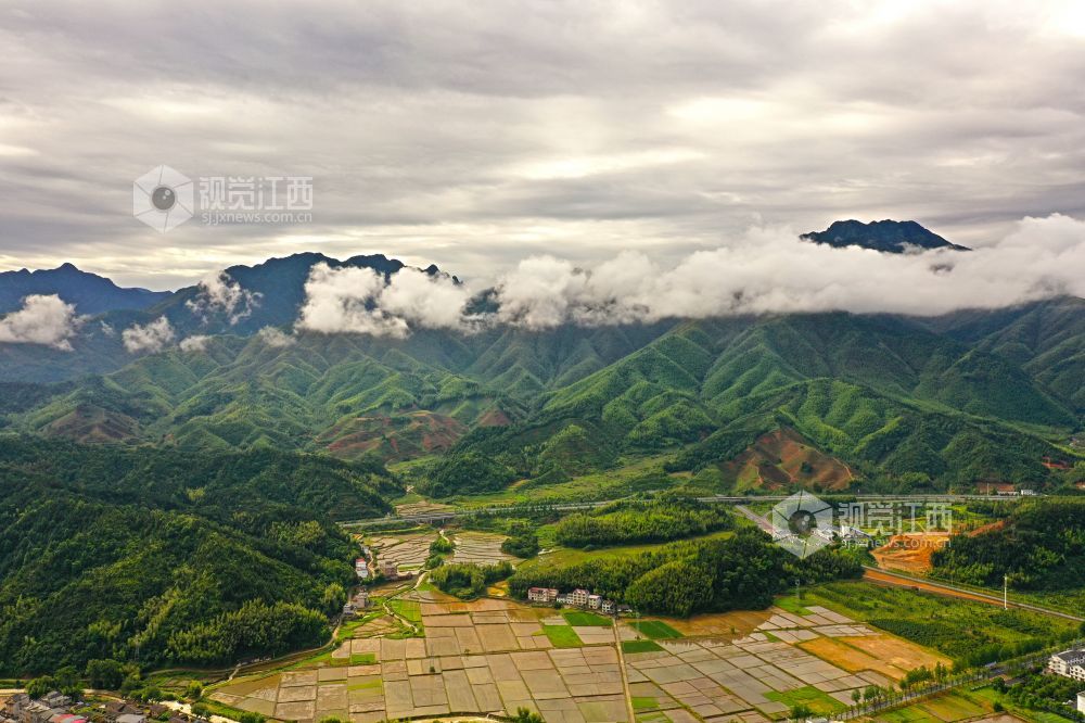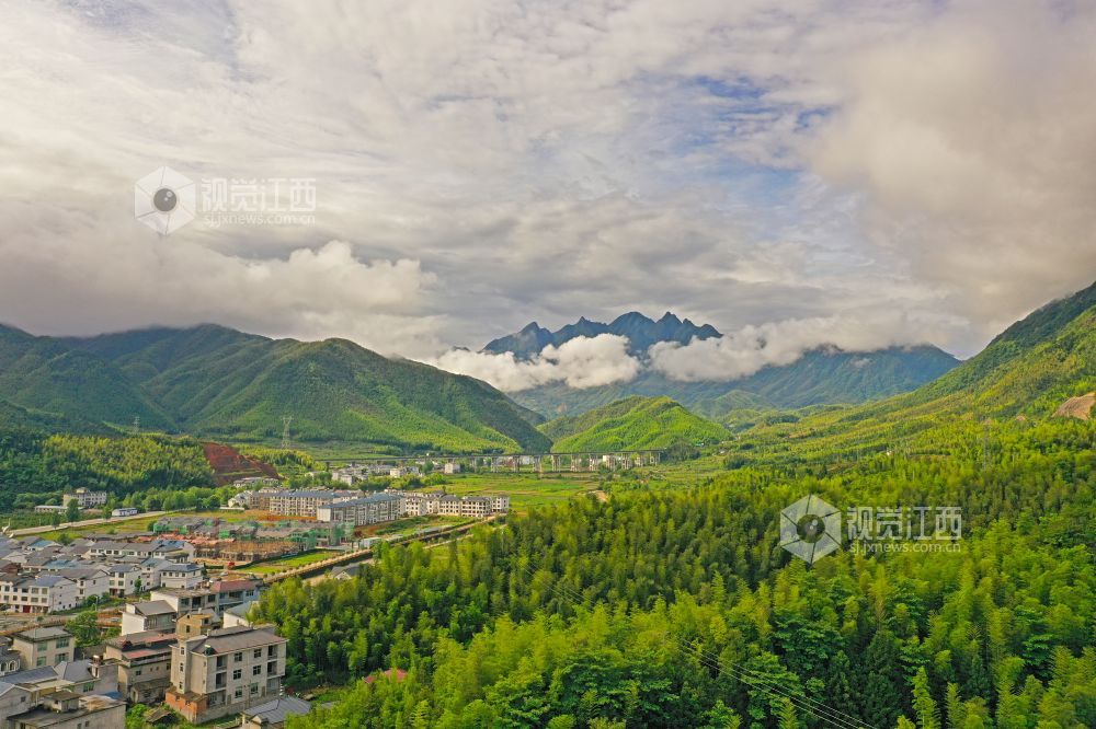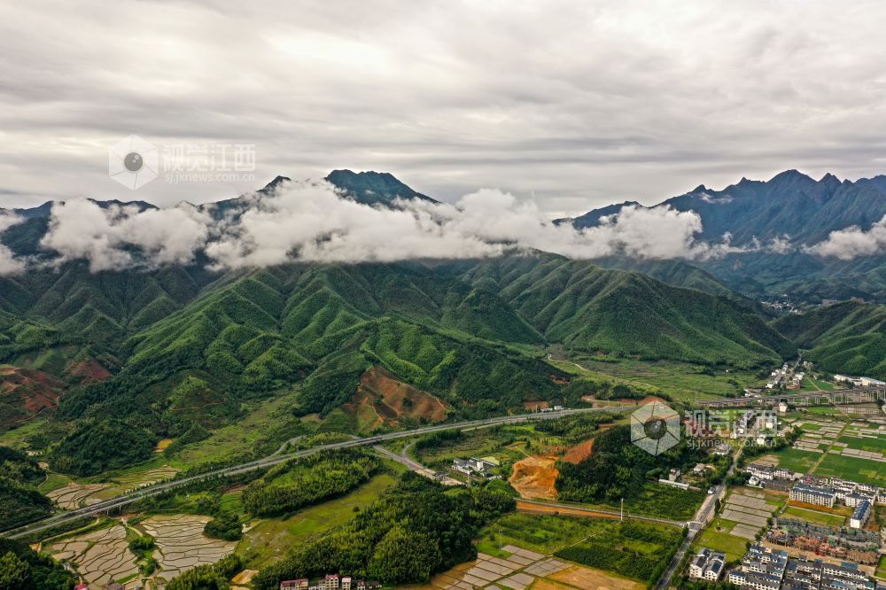 2021年5月27日,航拍江西省上饶市铅山县武夷山镇,被翠绿树木覆盖的高山、如棉花般的云朵与一丘丘水田、一栋栋民房形成了美丽的田园画卷。