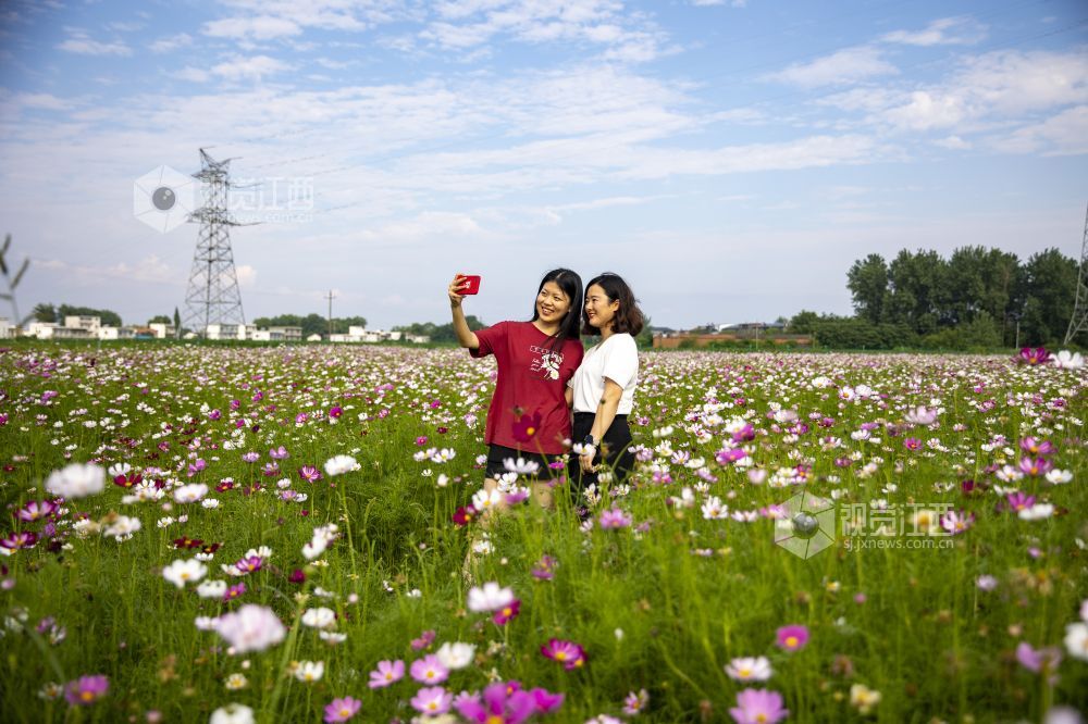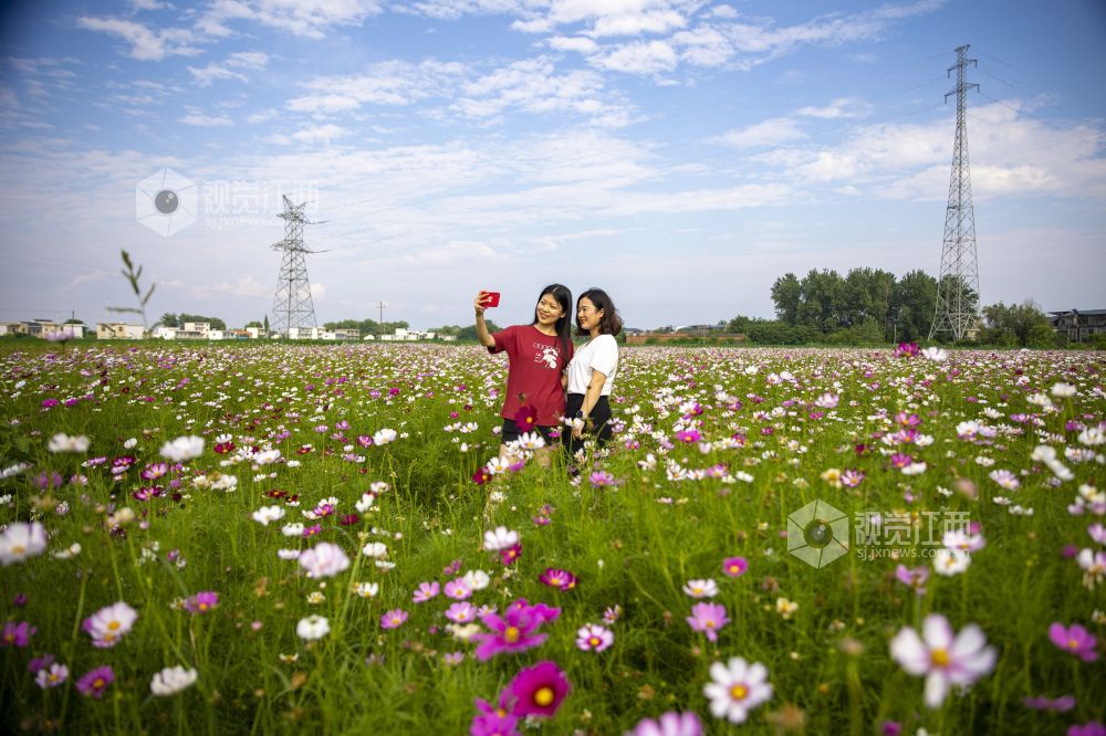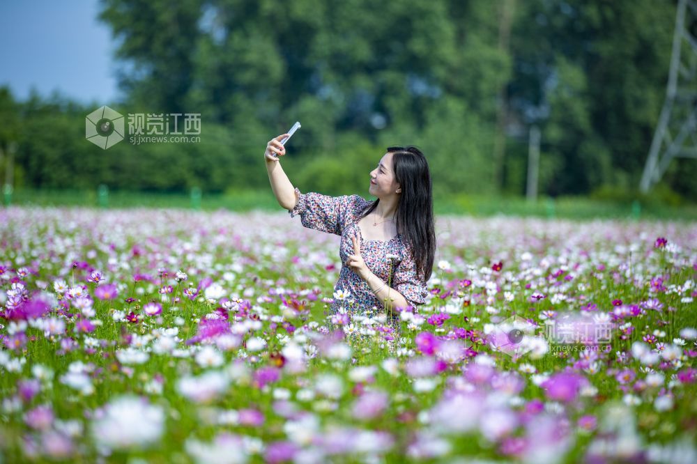 2021年6月1日,江西省九江市柴桑区江洲镇洲头村,200亩花海迎风绽放,花香远飘,吸引不少游客驻足拍照,成为当地又一处新的旅游打卡点。