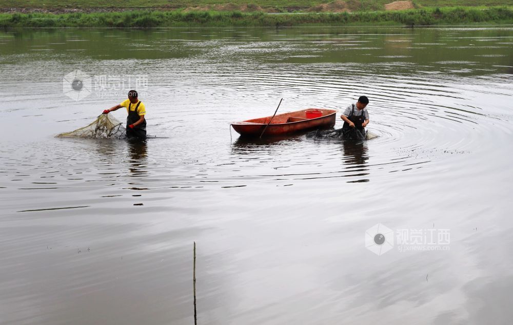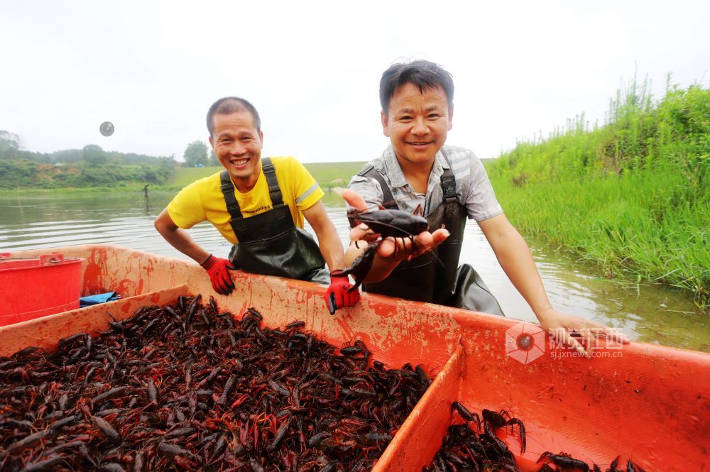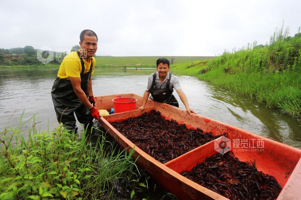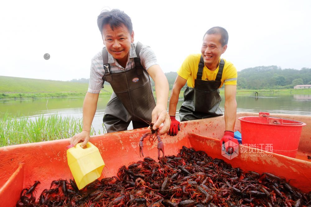 6月2日,江西省吉安市安福县竹江乡小车村稻虾共作基地负责人刘新益在捕捞小龙虾。