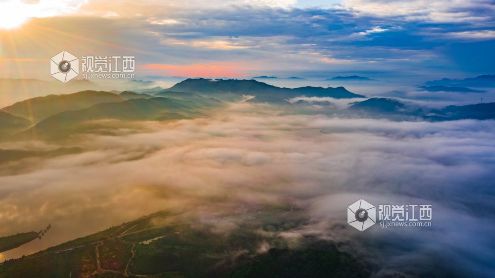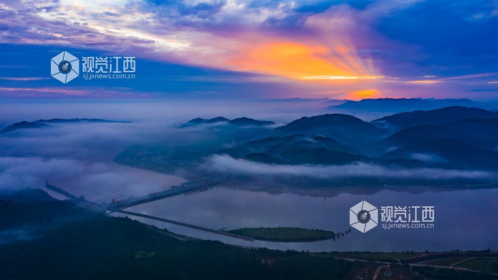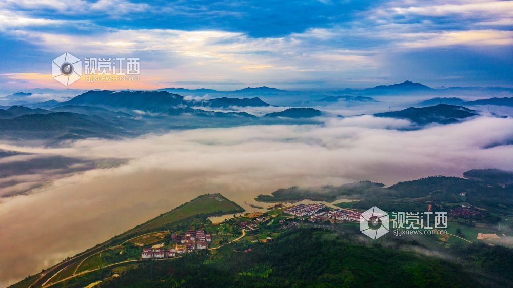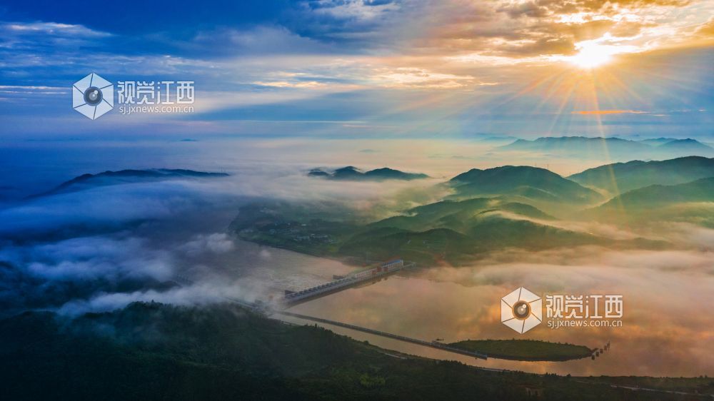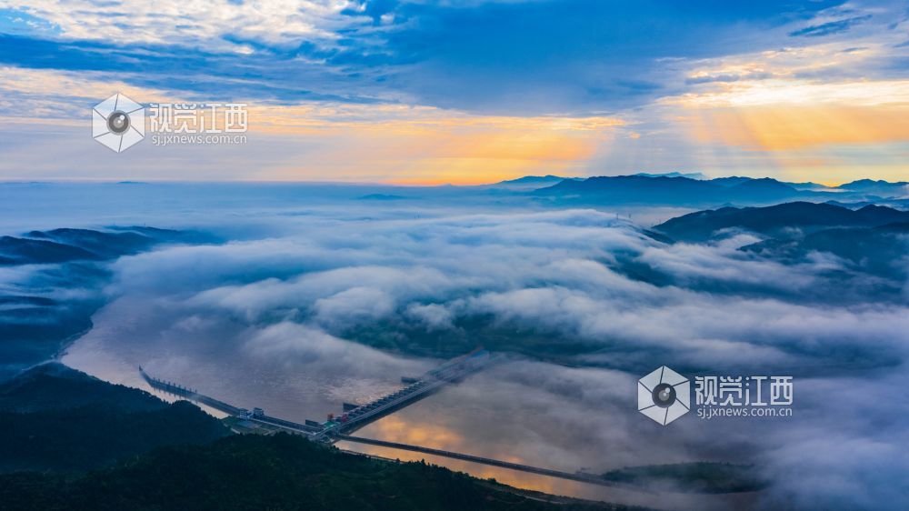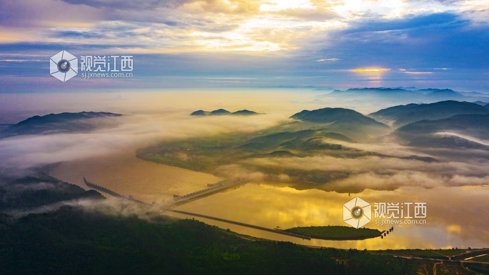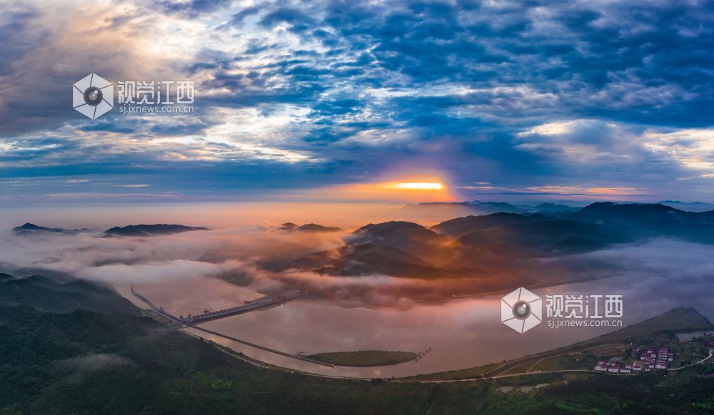 阵雨过后的清晨,正是观看云海日出的最佳时机。较大的昼夜温差使得江西省峡江县水利枢纽的坝上和上游的蒋沙移民新村形成云海日出的景观。放眼远望,漫漫云海在座座山峰间奔涌,时如飘逸的轻纱,时如滚滚波涛。莽莽群山和赣江之中,云海翻腾,云雾弥漫、波澜壮阔,蔚为壮观。云雾缭绕的村庄与云海、日出形成一幅画卷,美不胜收。