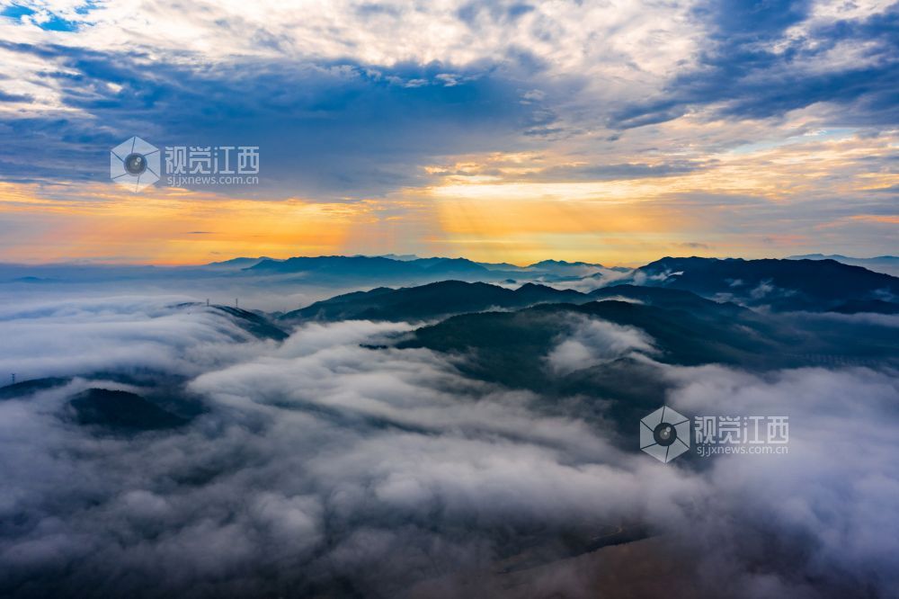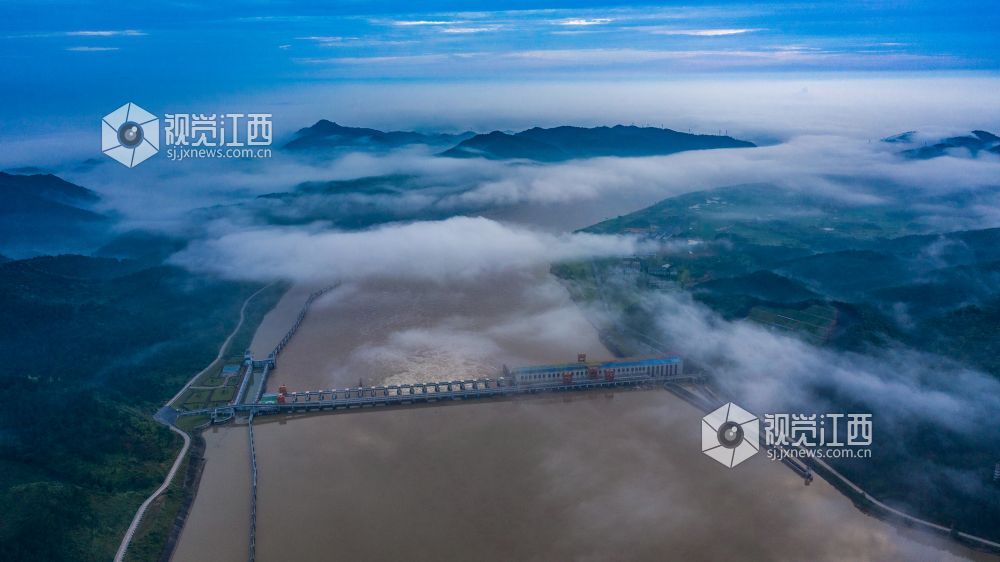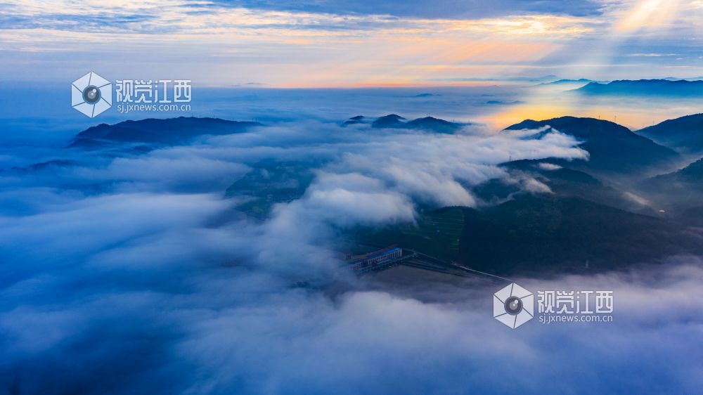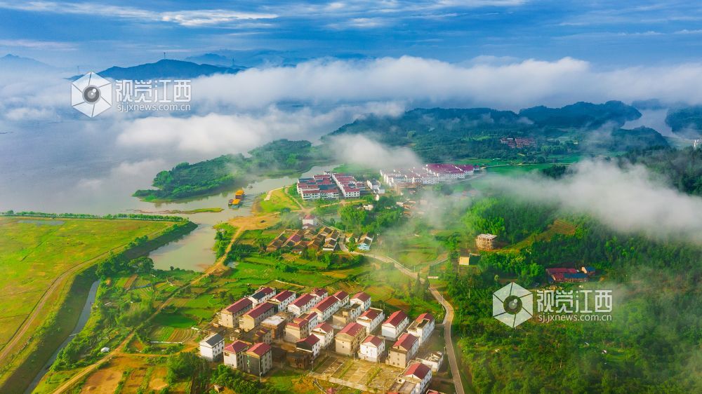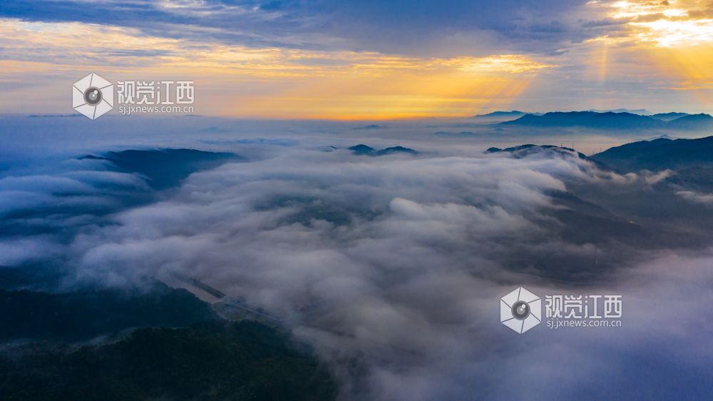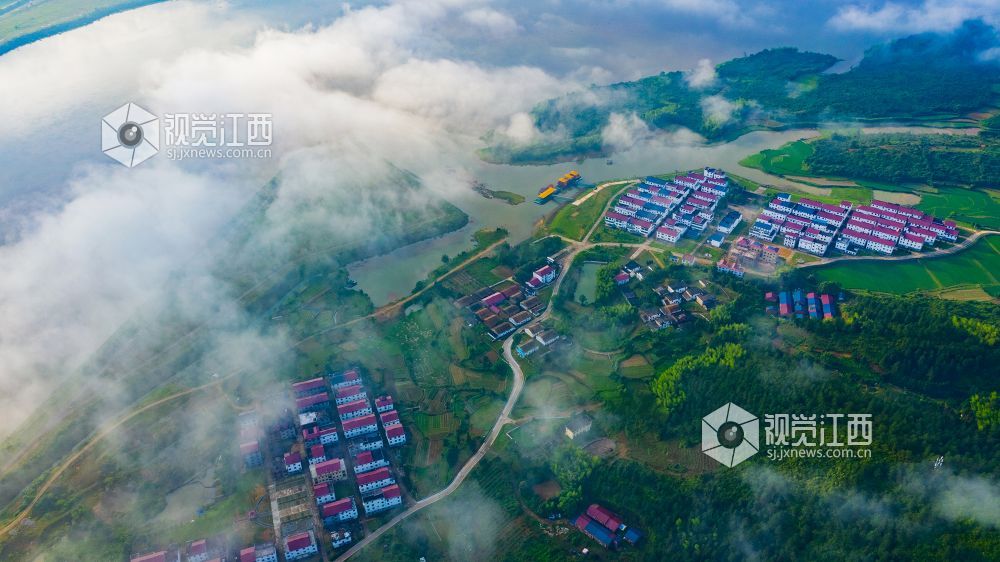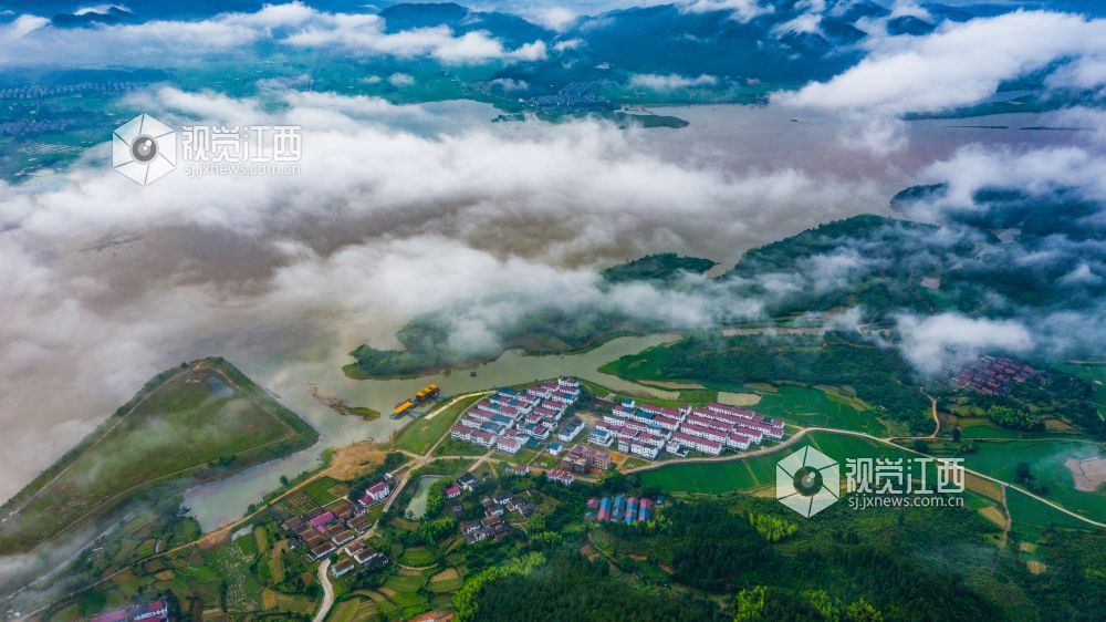 阵雨过后的清晨,正是观看云海日出的最佳时机。较大的昼夜温差使得江西省峡江县水利枢纽的坝上和上游的蒋沙移民新村形成云海日出的景观。放眼远望,漫漫云海在座座山峰间奔涌,时如飘逸的轻纱,时如滚滚波涛。莽莽群山和赣江之中,云海翻腾,云雾弥漫、波澜壮阔,蔚为壮观。云雾缭绕的村庄与云海、日出形成一幅画卷,美不胜收。