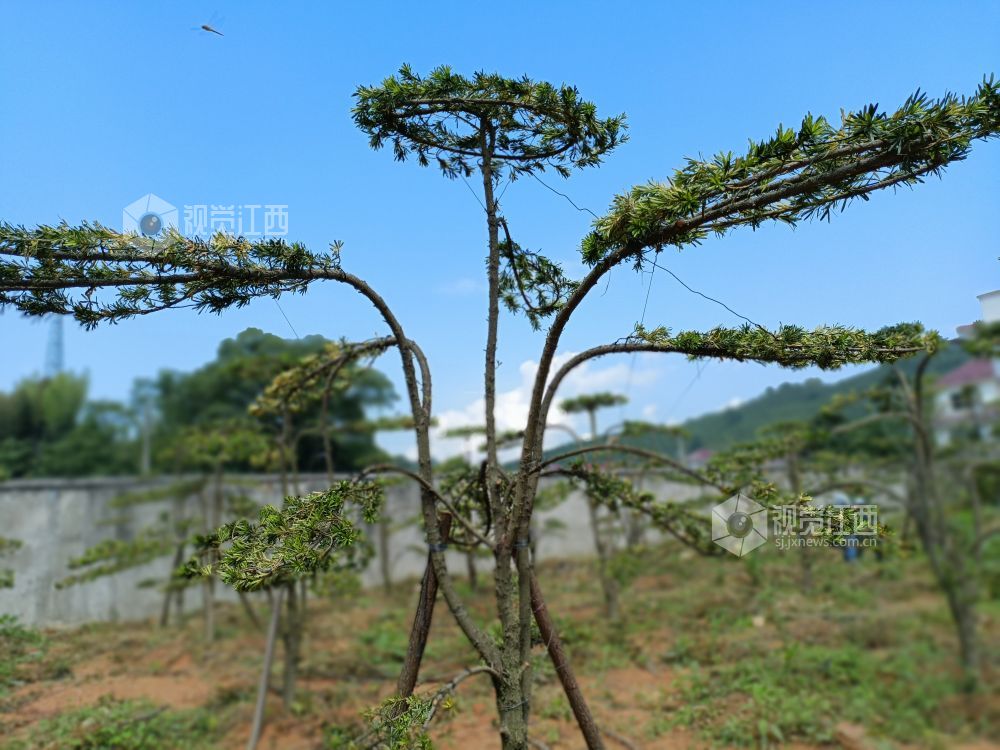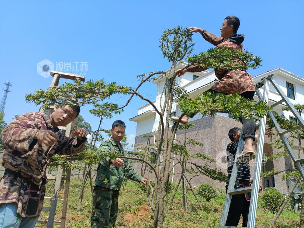 6月9日,江西省安福县明月山林场彭坊管护站职工正在对院内绿化树木罗汉松修枝整型。
