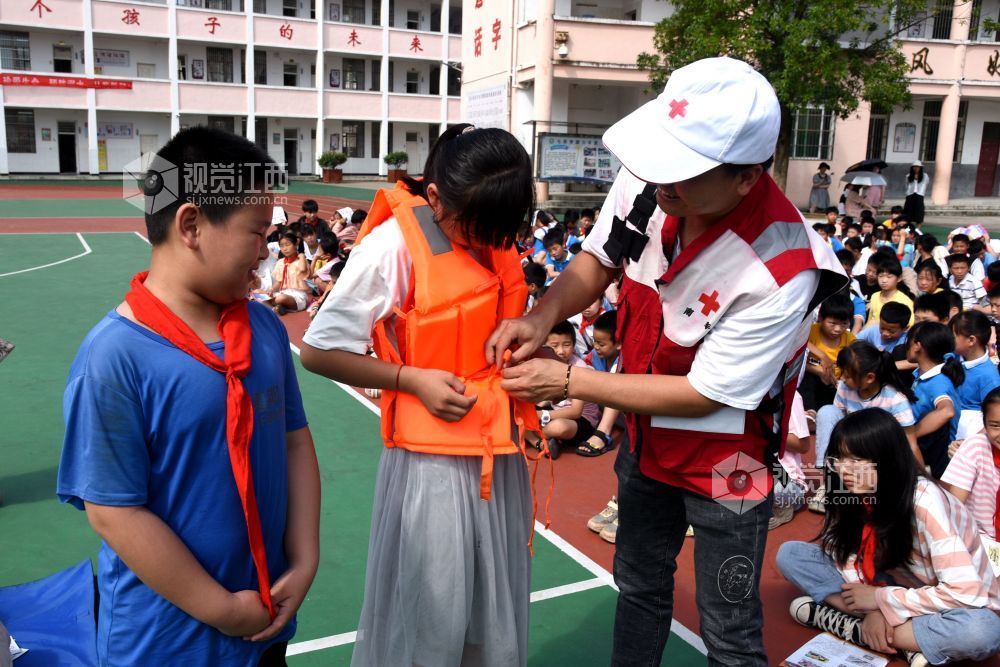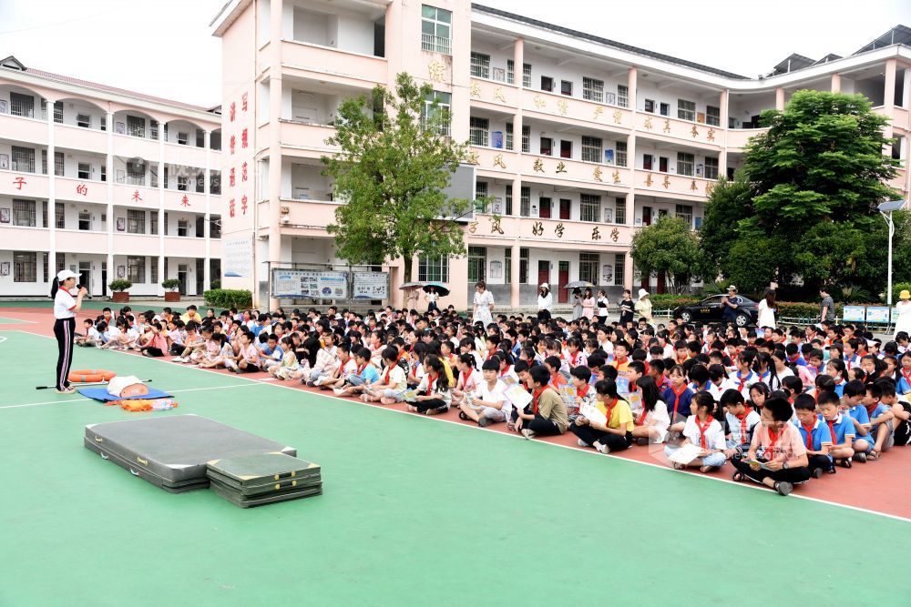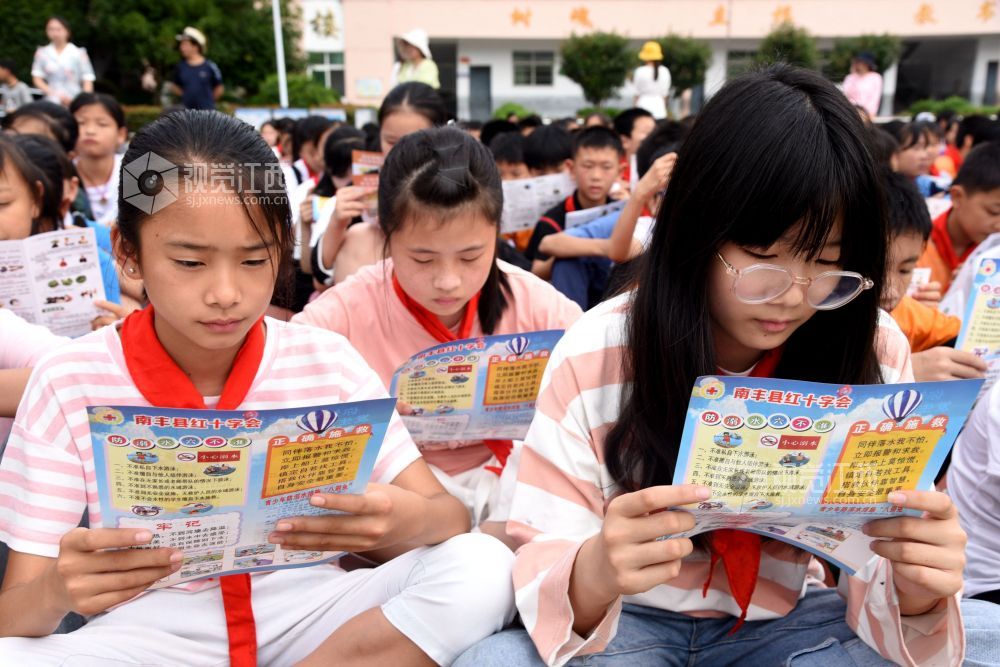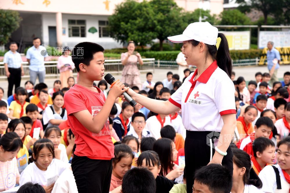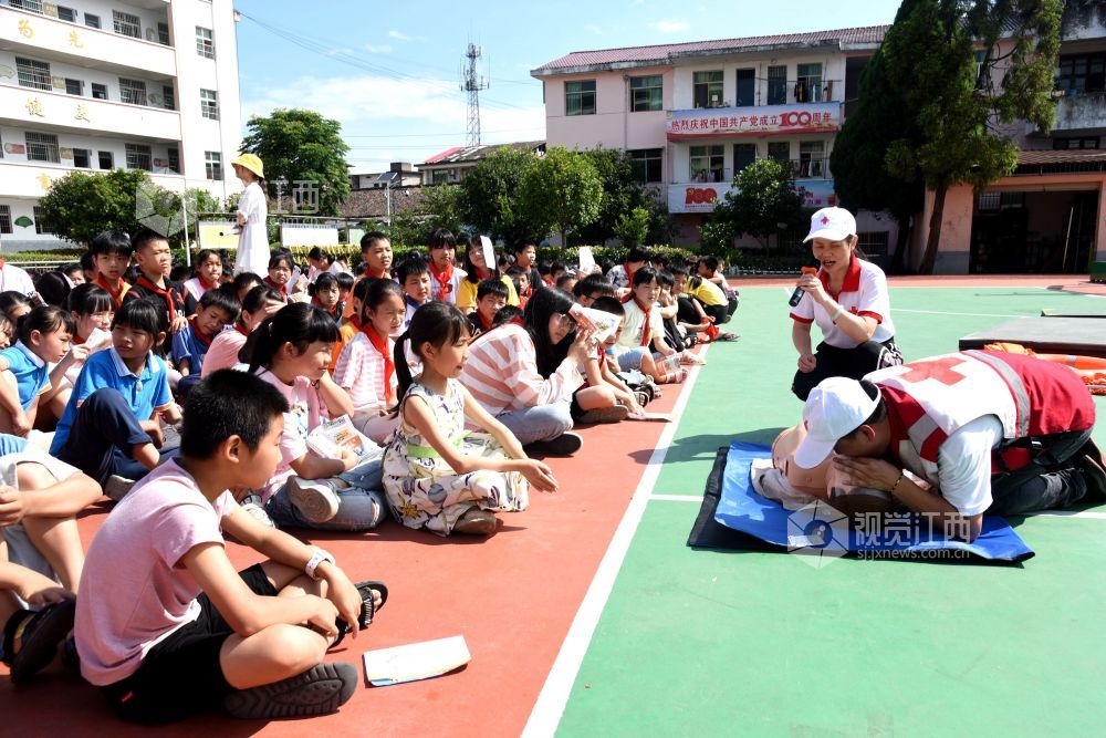 2021年6月10日,在江西省抚州市南丰县白舍镇中心小学操场上,县红十字会的工作人员正在向该校五年级、六年级500多名学生传授防溺水知识,做到警钟长鸣。